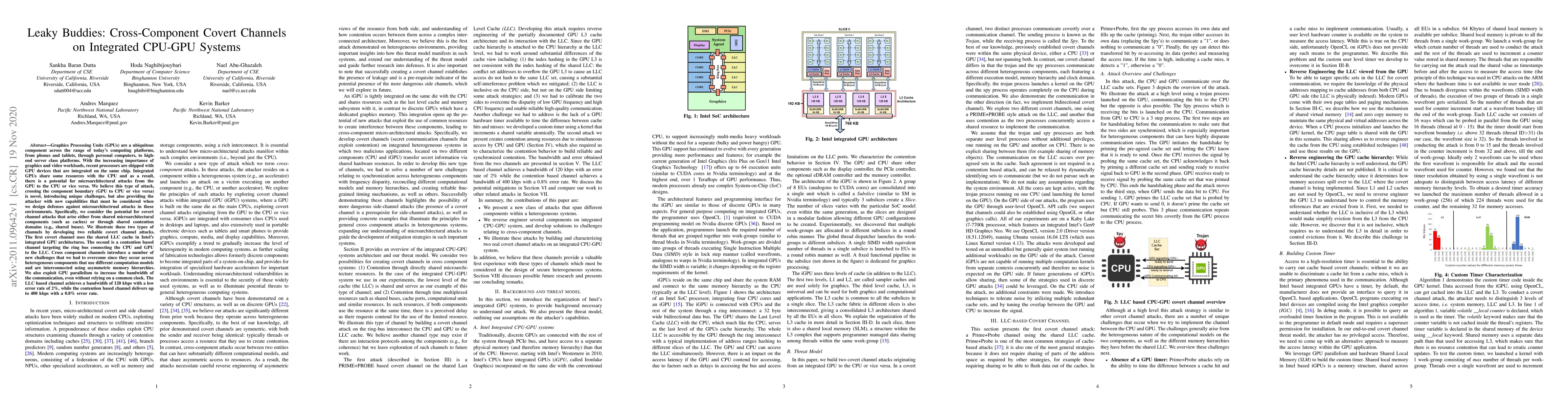 This paper explores covert channels that exploit shared resources between integrated CPU-GPU systems, demonstrating attacks via the shared Last Level Cache (LLC) and contention on the ring bus. It reveals significant bandwidths (120 kbps and 400 kbps) and low error rates, highlighting new challenges in defending against microarchitectural attacks across heterogeneous components.