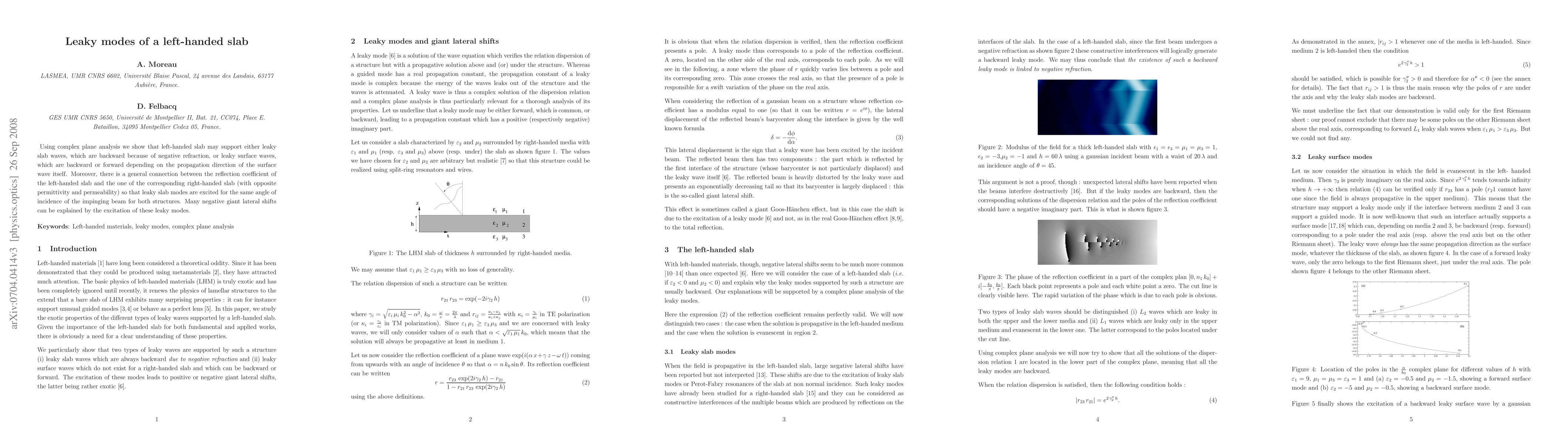 Using complex plane analysis we show that left-handed slab may support either leaky slab waves, which are backward because of negative refraction, or leaky surface waves, which are backward or forward depending on the propagation direction of the surface wave itself. Moreover, there is a general connection between the reflection coefficient of the left-handed slab and the one of the corresponding right-handed slab (with opposite permittivity and permeability) so that leaky slab modes are excited for the same angle of incidence of the impinging beam for both structures. Many negative giant lateral shifts can be explained by the excitation of these leaky modes.