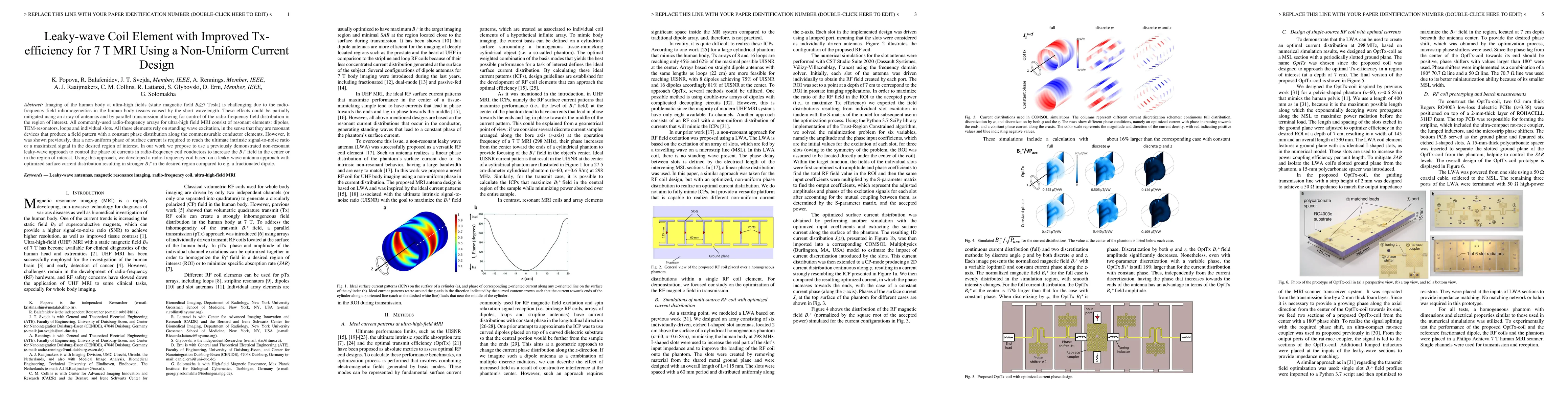 Imaging of the human body at ultra-high fields (static magnetic field B0>7 Tesla) is challenging due to the radio-frequency field inhomogeneities in the human body tissues caused by the short wavelength. These effects could be partially mitigated using an array of antennas and by parallel transmission allowing for control of the radio-frequency field distribution in the region of interest. All commonly-used radio-frequency arrays for ultra-high field MRI consist of resonant elements: dipoles, TEM-resonators, loops and individual slots. All these elements rely on standing wave excitation, in the sense that they are resonant devices that produce a field pattern with a constant phase distribution along the commensurable conductor elements. However, it was shown previously, that a non-uniform phase of surface current is required to reach the ultimate intrinsic signal-to-noise ratio or a maximized signal in the desired region of interest. In our work we propose to use a previously demonstrated non-resonant leaky-wave approach to control the phase of currents in radio-frequency coil conductors to increase the B1+ field in the center or in the region of interest. Using this approach, we developed a radio-frequency coil based on a leaky-wave antenna approach with optimized surface current distribution resulting in stronger B1+ in the desired region compared to e.g. a fractionated dipole.