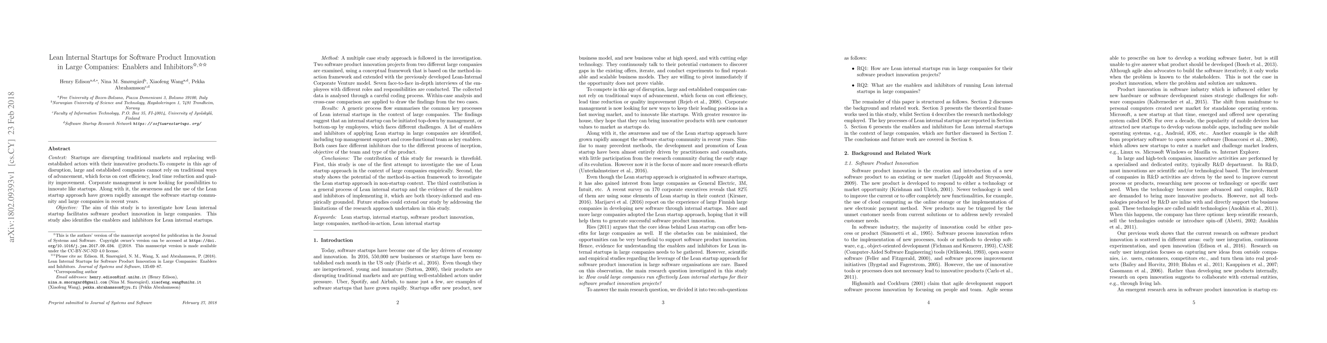 This study explores how Lean internal startups foster software product innovation in large companies, identifying both enablers and inhibitors through a multiple case study approach. The research highlights top management support and cross-functional teams as key enablers, while also noting various inhibitors specific to the companies' unique contexts.