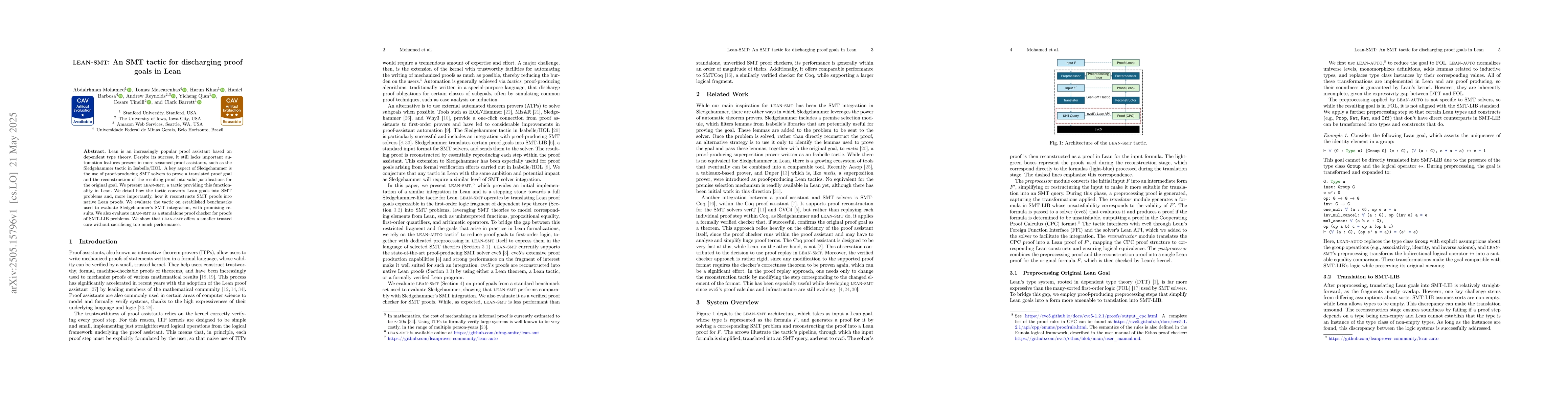 Lean-SMT is a new tactic in Lean that uses proof-producing SMT solvers to discharge proof goals and reconstructs the results into native Lean proofs, offering a smaller trusted core without sacrificing performance.