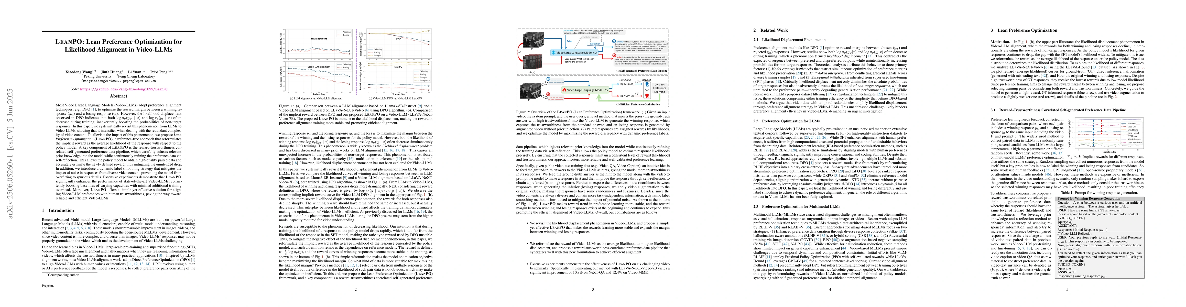LeanPO optimizes Video-LLMs to align preferences with human trustworthiness by reformulating implicit rewards as average likelihoods of policy model responses, improving performance and efficiency.