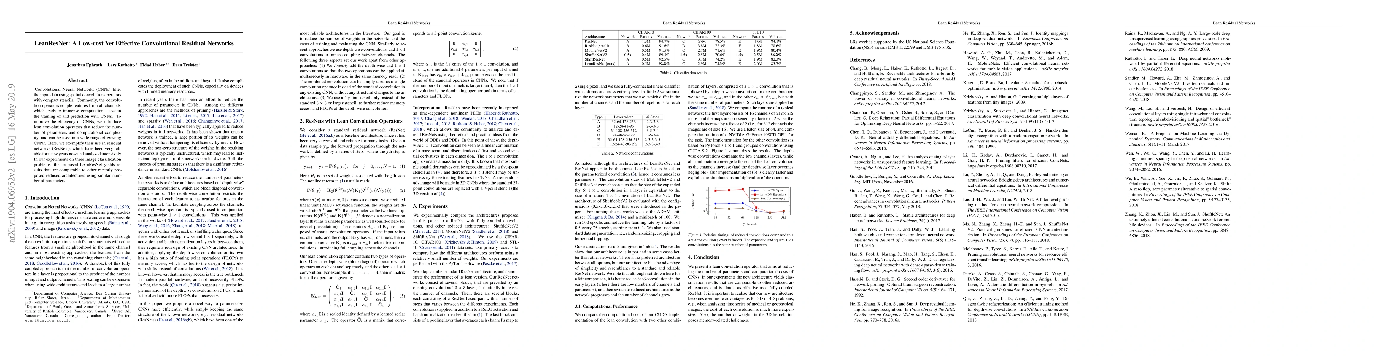 Convolutional Neural Networks (CNNs) filter the input data using spatial convolution operators with compact stencils. Commonly, the convolution operators couple features from all channels, which leads to immense computational cost in the training of and prediction with CNNs. To improve the efficiency of CNNs, we introduce lean convolution operators that reduce the number of parameters and computational complexity, and can be used in a wide range of existing CNNs. Here, we exemplify their use in residual networks (ResNets), which have been very reliable for a few years now and analyzed intensively. In our experiments on three image classification problems, the proposed LeanResNet yields results that are comparable to other recently proposed reduced architectures using similar number of parameters.