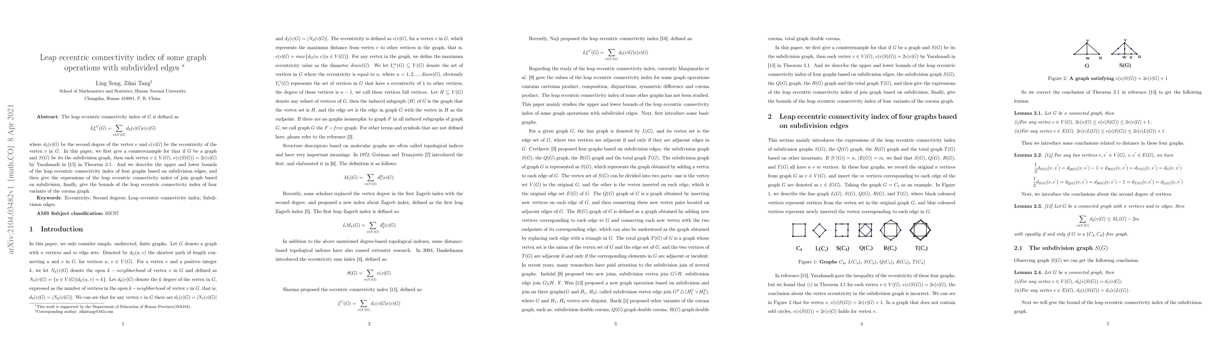 The leap eccentric connectivity index of $G$ is defined as $$L\xi^{C}(G)=\sum_{v\in V(G)}d_{2}(v|G)e(v|G)$$ where $d_{2}(v|G) $ be the second degree of the vertex $v$ and $e(v|G)$ be the eccentricity of the vertex $v$ in $G$. In this paper, we first give a counterexample for that if $G$ be a graph and $S(G)$ be its the subdivision graph, then each vertex $v\in V(G)$, $e(v|S(G))=2e(v|G)$ by Yarahmadi in \cite{yar14} in Theorem 3.1. And we describe the upper and lower bounds of the leap eccentric connectivity index of four graphs based on subdivision edges, and then give the expressions of the leap eccentric connectivity index of join graph based on subdivision, finally, give the bounds of the leap eccentric connectivity index of four variants of the corona graph.