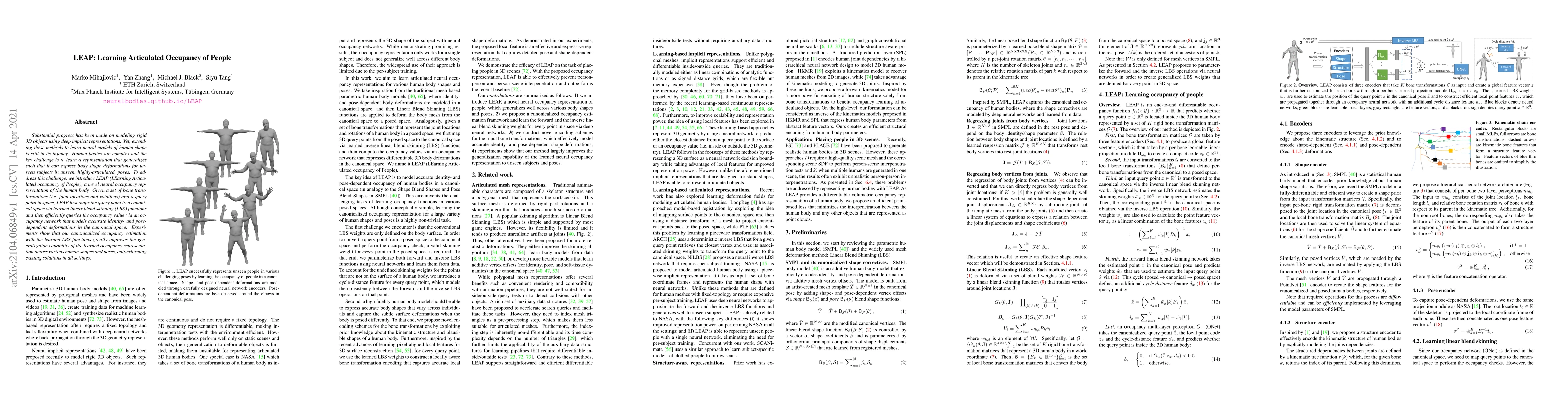 LEAP introduces a novel neural occupancy representation for human bodies, utilizing learned linear blend skinning functions to map query points to a canonical space, followed by an occupancy network that models deformations. This approach significantly enhances generalization across diverse human shapes and poses, outperforming existing methods.