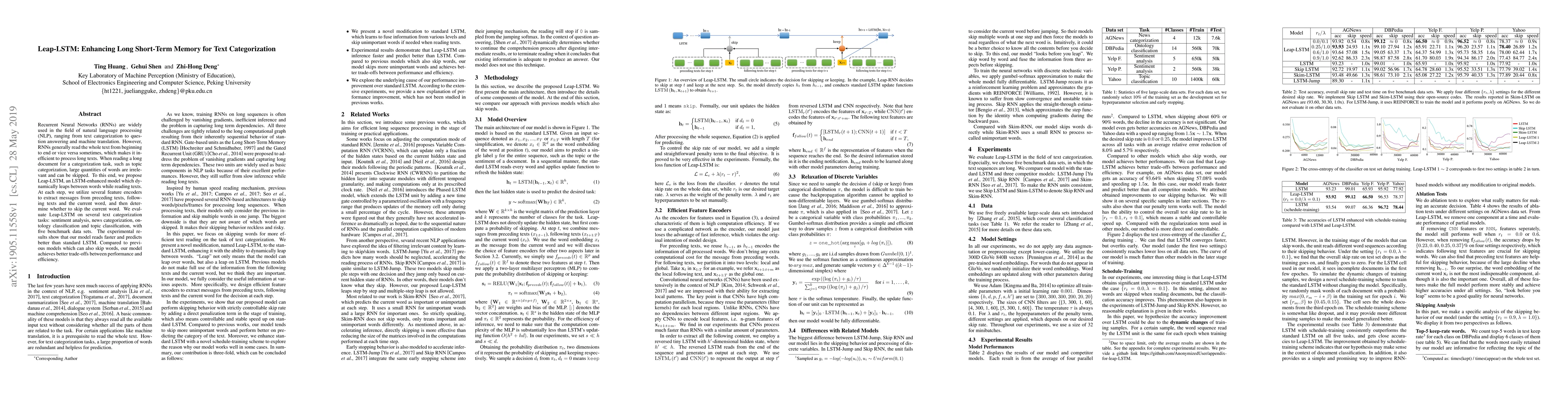 Leap-LSTM enhances LSTM for text categorization by dynamically skipping irrelevant words, improving both processing speed and prediction accuracy over standard LSTM. Evaluated on various text categorization tasks, it outperforms previous models in balancing efficiency and performance.