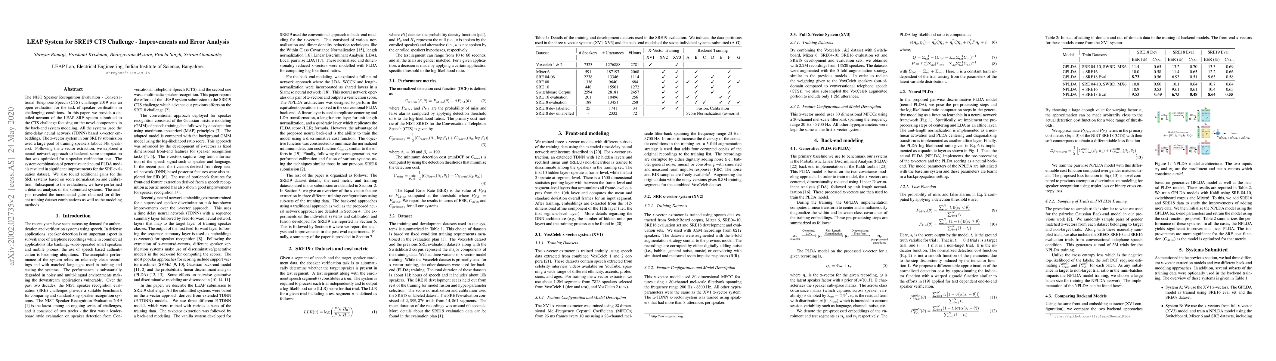 The NIST Speaker Recognition Evaluation - Conversational Telephone Speech (CTS) challenge 2019 was an open evaluation for the task of speaker verification in challenging conditions. In this paper, we provide a detailed account of the LEAP SRE system submitted to the CTS challenge focusing on the novel components in the back-end system modeling. All the systems used the time-delay neural network (TDNN) based x-vector embeddings. The x-vector system in our SRE19 submission used a large pool of training speakers (about 14k speakers). Following the x-vector extraction, we explored a neural network approach to backend score computation that was optimized for a speaker verification cost. The system combination of generative and neural PLDA models resulted in significant improvements for the SRE evaluation dataset. We also found additional gains for the SRE systems based on score normalization and calibration. Subsequent to the evaluations, we have performed a detailed analysis of the submitted systems. The analysis revealed the incremental gains obtained for different training dataset combinations as well as the modeling methods.