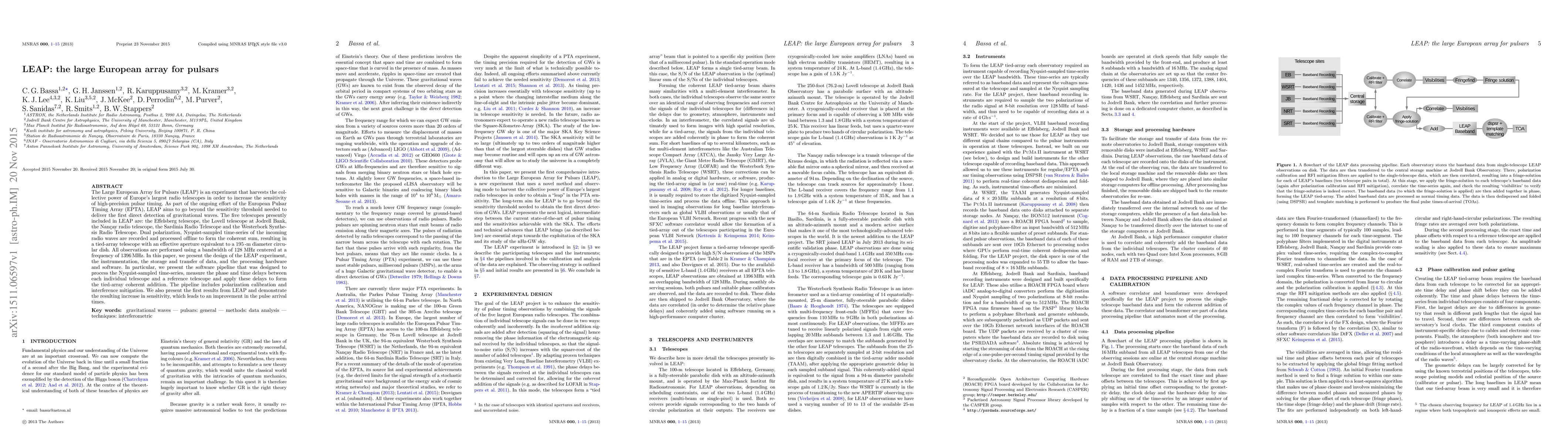 The Large European Array for Pulsars (LEAP) is an experiment that harvests the collective power of Europe's largest radio telescopes in order to increase the sensitivity of high-precision pulsar timing. As part of the ongoing effort of the European Pulsar Timing Array (EPTA), LEAP aims to go beyond the sensitivity threshold needed to deliver the first direct detection of gravitational waves. The five telescopes presently included in LEAP are: the Effelsberg telescope, the Lovell telescope at Jodrell Bank, the Nan\c cay radio telescope, the Sardinia Radio Telescope and the Westerbork Synthesis Radio Telescope. Dual polarization, Nyquist-sampled time-series of the incoming radio waves are recorded and processed offline to form the coherent sum, resulting in a tied-array telescope with an effective aperture equivalent to a 195-m diameter circular dish. All observations are performed using a bandwidth of 128 MHz centered at a frequency of 1396 MHz. In this paper, we present the design of the LEAP experiment, the instrumentation, the storage and transfer of data, and the processing hardware and software. In particular, we present the software pipeline that was designed to process the Nyquist-sampled time-series, measure the phase and time delays between each individual telescope and a reference telescope and apply these delays to form the tied-array coherent addition. The pipeline includes polarization calibration and interference mitigation. We also present the first results from LEAP and demonstrate the resulting increase in sensitivity, which leads to an improvement in the pulse arrival times.