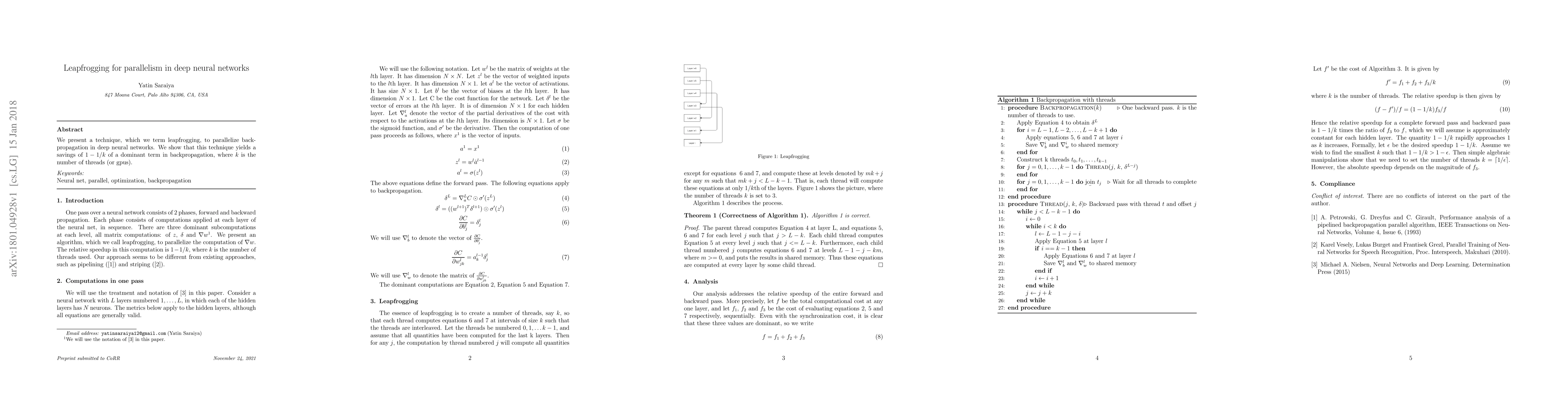 Researchers introduce a technique called leapfrogging to improve parallelism in deep neural networks, reducing the dominant term in backpropagation by $1-1/k$. This approach is expected to yield significant savings when using multiple threads or GPUs.