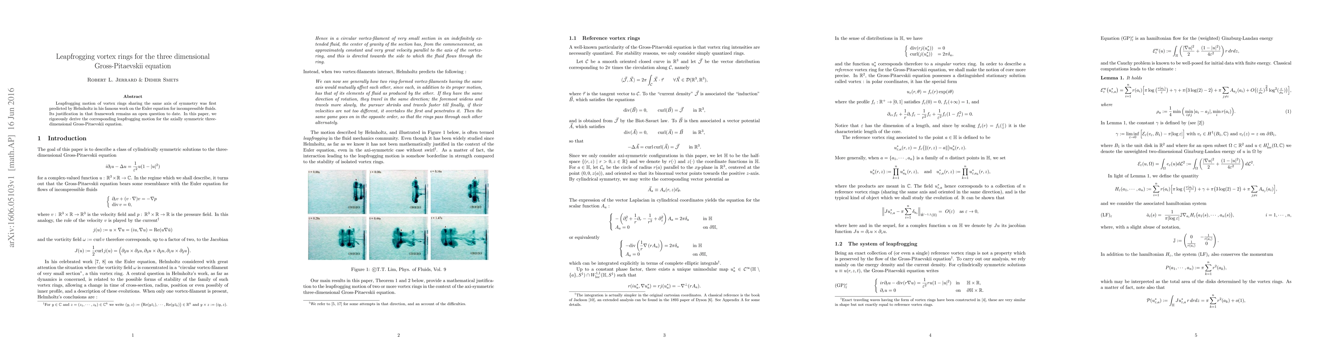 This paper rigorously derives the leapfrogging motion of vortex rings sharing the same axis of symmetry for the axially symmetric three-dimensional Gross-Pitaevskii equation, extending Helmholtz's prediction from the Euler equation for incompressible fluids.