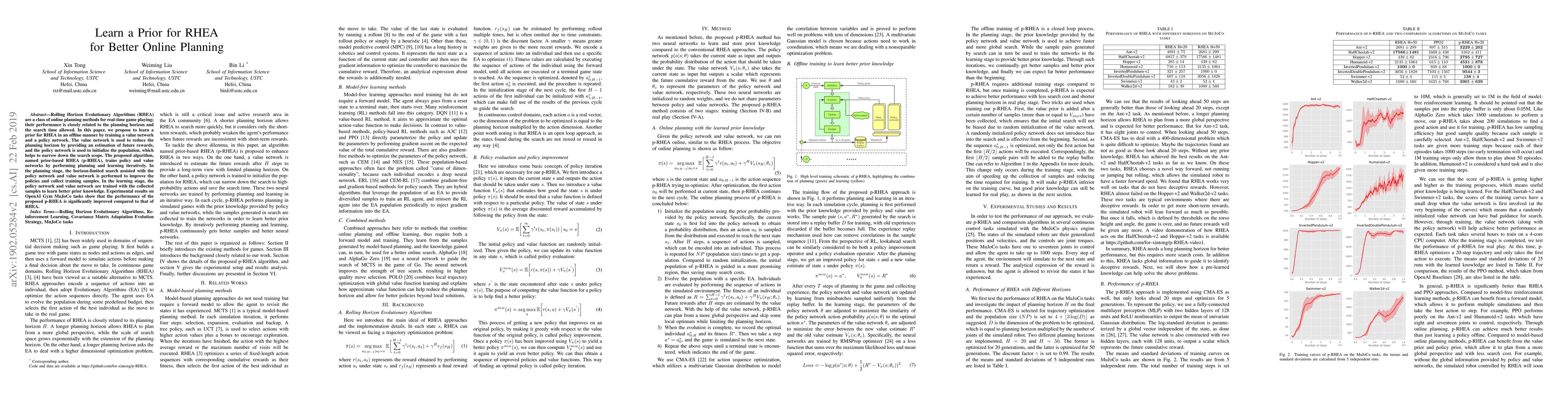 Rolling Horizon Evolutionary Algorithms (RHEA) are a class of online planning methods for real-time game playing; their performance is closely related to the planning horizon and the search time allowed. In this paper, we propose to learn a prior for RHEA in an offline manner by training a value network and a policy network. The value network is used to reduce the planning horizon by providing an estimation of future rewards, and the policy network is used to initialize the population, which helps to narrow down the search scope. The proposed algorithm, named prior-based RHEA (p-RHEA), trains policy and value networks by performing planning and learning iteratively. In the planning stage, the horizon-limited search assisted with the policy network and value network is performed to improve the policies and collect training samples. In the learning stage, the policy network and value network are trained with the collected samples to learn better prior knowledge. Experimental results on OpenAI Gym MuJoCo tasks show that the performance of the proposed p-RHEA is significantly improved compared to that of RHEA.