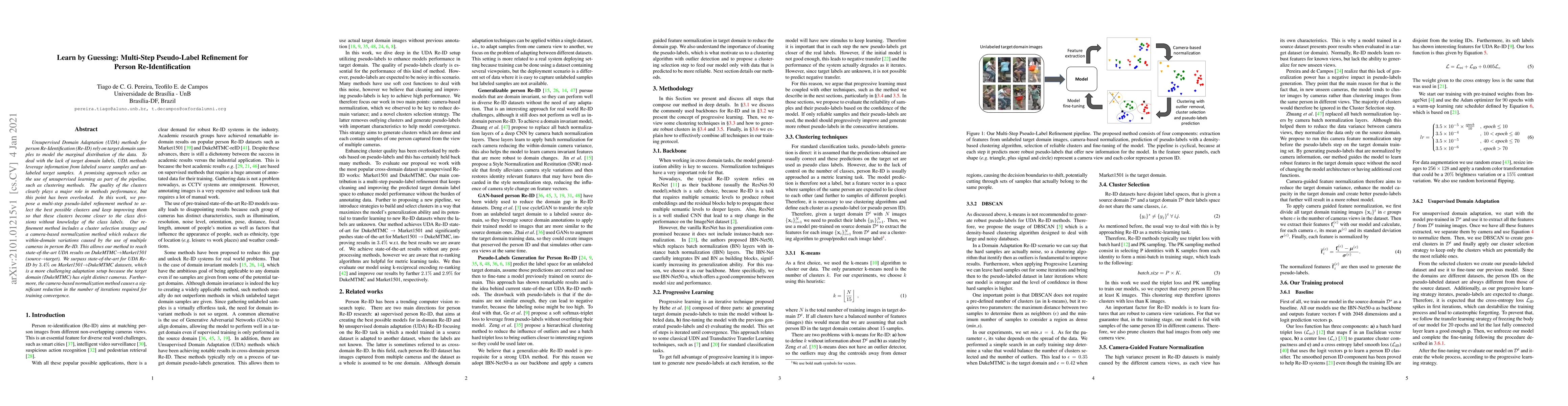 This paper proposes a multi-step pseudo-label refinement method for unsupervised domain adaptation in person re-identification, improving cluster quality without class labels. The method includes a cluster selection strategy and camera-based normalization, achieving state-of-the-art results on DukeMTMC-Market1501 datasets, surpassing previous methods by 3.4%.