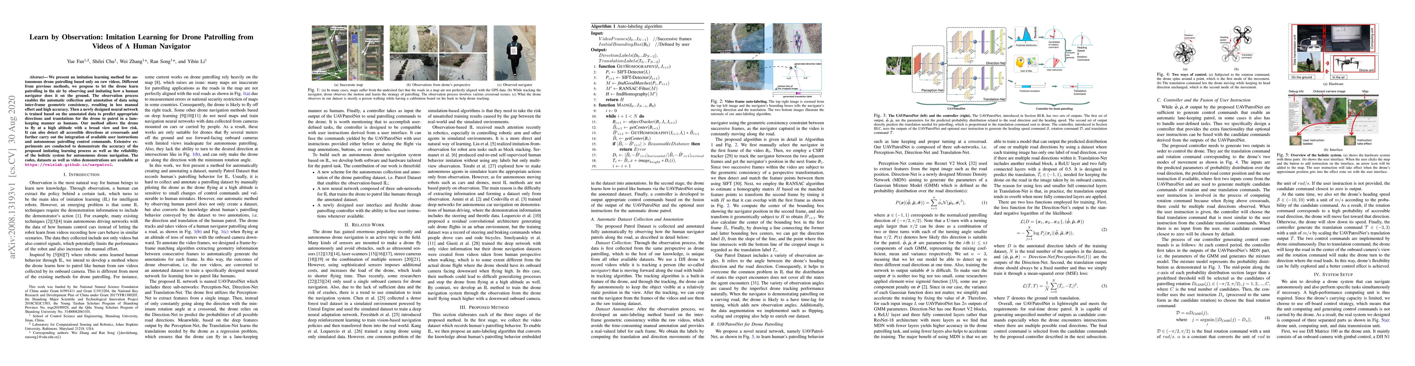 This paper proposes an imitation learning method for autonomous drone patrolling using videos of a human navigator. The method involves observing and imitating human navigation to automate data collection and annotation, leading to high accuracy and reduced manual effort.