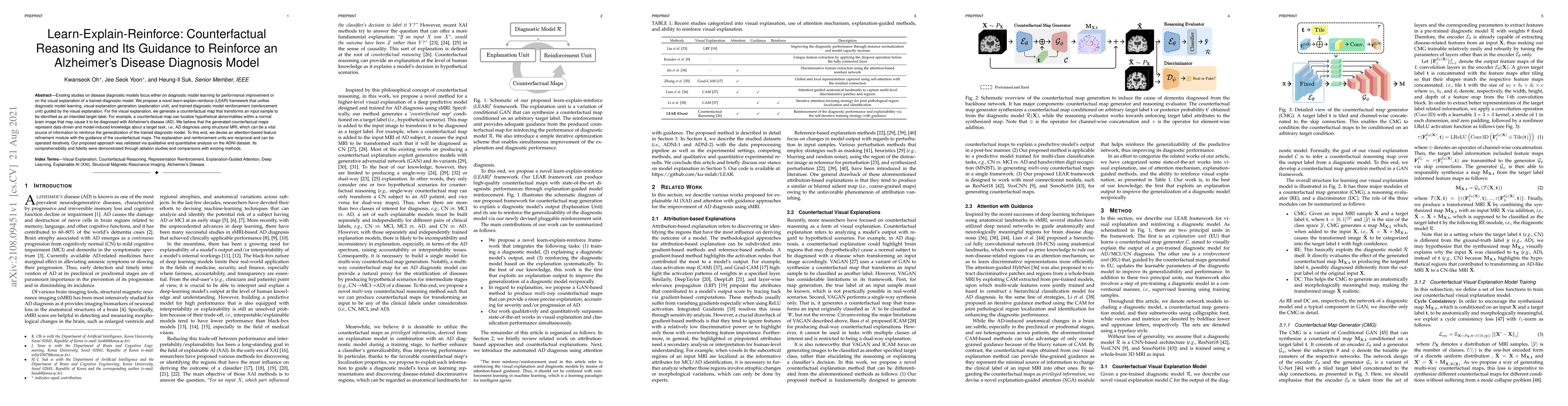 The paper proposes a novel LEAR framework that integrates model learning, visual explanation generation, and reinforcement for Alzheimer's disease diagnosis. The framework uses counterfactual maps to generate visual explanations that guide the reinforcement of the diagnostic model, enhancing its generalization. The approach was validated on the ADNI dataset, showing improved comprehensibility and fidelity.