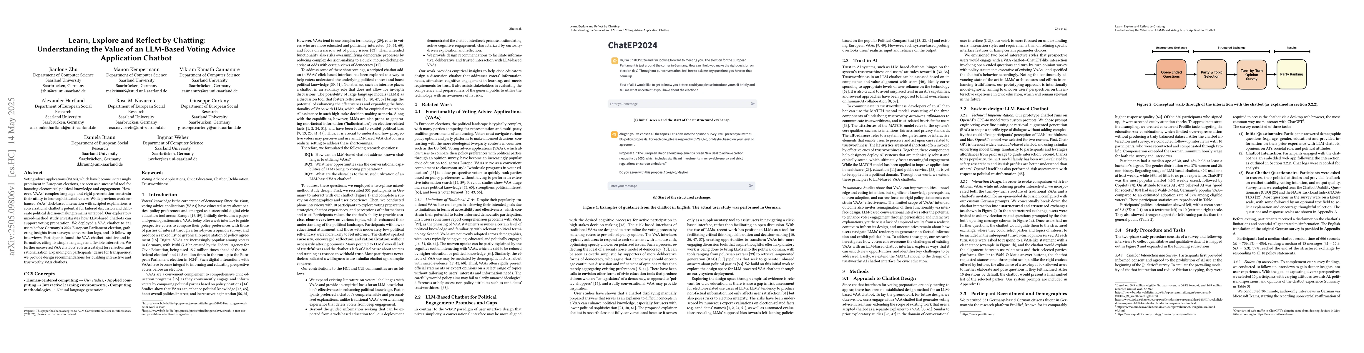 The study employed an exploratory mixed-methods approach, involving 331 users interacting with a Large Language Model (LLM)-based Voting Advice Application (VAA) chatbot before Germany's 2024 European Parliament election. Data was collected through surveys, conversation logs, and 10 follow-up interviews.