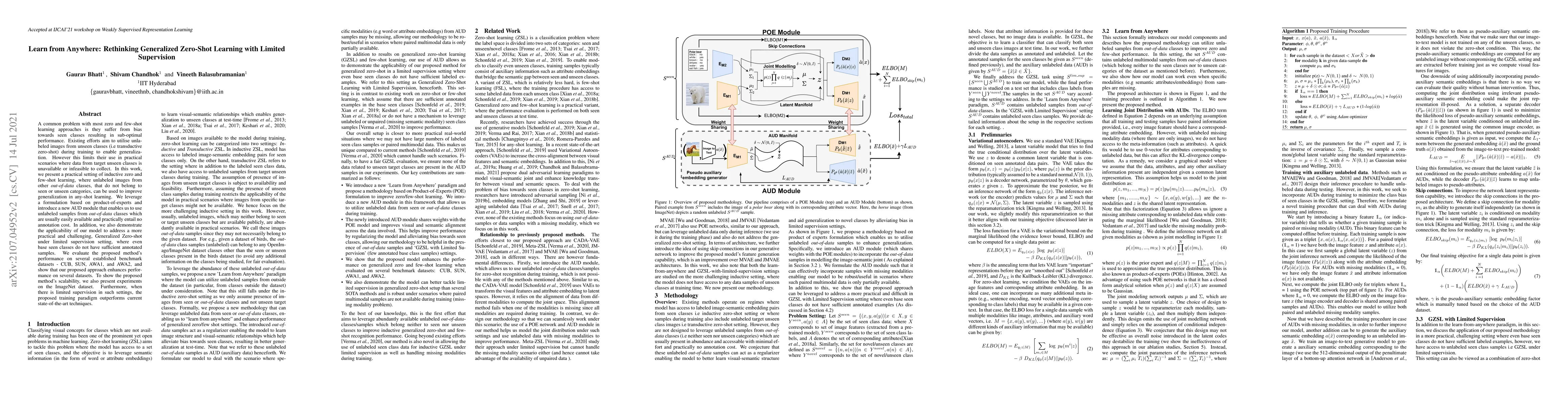 This paper proposes a method to enhance zero-shot learning by utilizing unlabeled images from out-of-data classes to improve generalization, addressing the bias towards seen classes and enabling practical use in scenarios with limited data availability. The approach introduces an AUD module and a product-of-experts formulation, demonstrating effectiveness in generalized zero-shot learning under limited supervision.