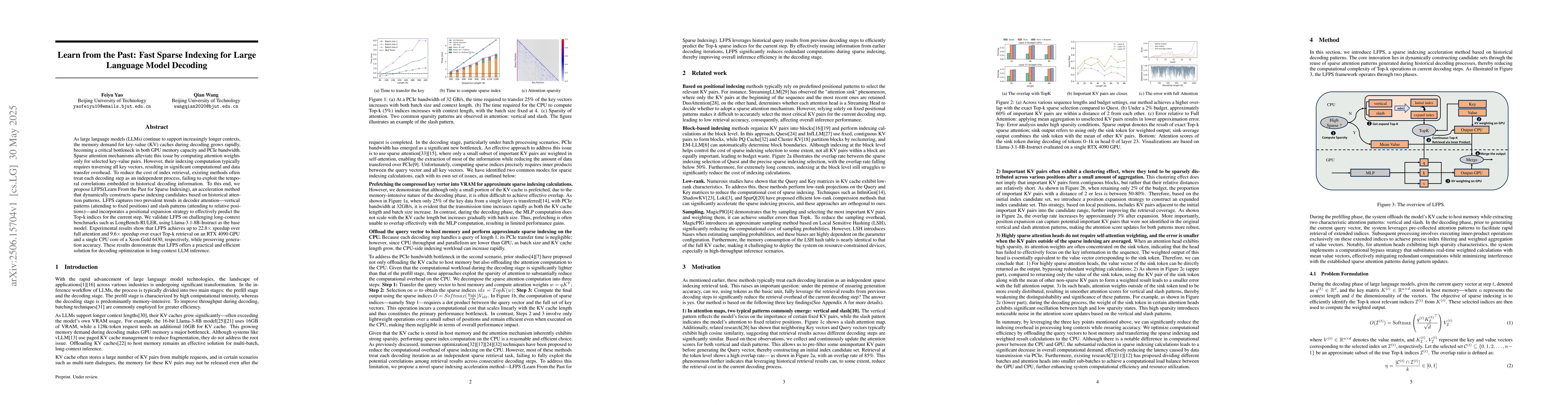 As large language models (LLMs) continue to support increasingly longer contexts, the memory demand for key-value (KV) caches during decoding grows rapidly, becoming a critical bottleneck in both GPU memory capacity and PCIe bandwidth. Sparse attention mechanisms alleviate this issue by computing attention weights only for selected key-value pairs. However, their indexing computation typically requires traversing all key vectors, resulting in significant computational and data transfer overhead. To reduce the cost of index retrieval, existing methods often treat each decoding step as an independent process, failing to exploit the temporal correlations embedded in historical decoding information. To this end, we propose LFPS(Learn From the Past for Sparse Indexing), an acceleration method that dynamically constructs sparse indexing candidates based on historical attention patterns. LFPS captures two prevalent trends in decoder attention -vertical patterns (attending to fixed positions) and slash patterns (attending to relative positions) -and incorporates a positional expansion strategy to effectively predict the Top-k indices for the current step. We validate LFPS on challenging long-context benchmarks such as LongBench-RULER, using Llama-3.1-8B-Instruct as the base model. Experimental results show that LFPS achieves up to 22.8$\times$ speedup over full attention and 9.6$\times$ speedup over exact Top-k retrieval on an RTX 4090 GPU and a single CPU core of a Xeon Gold 6430, respectively, while preserving generation accuracy. These results demonstrate that LFPS offers a practical and efficient solution for decoding optimization in long-context LLM inference.