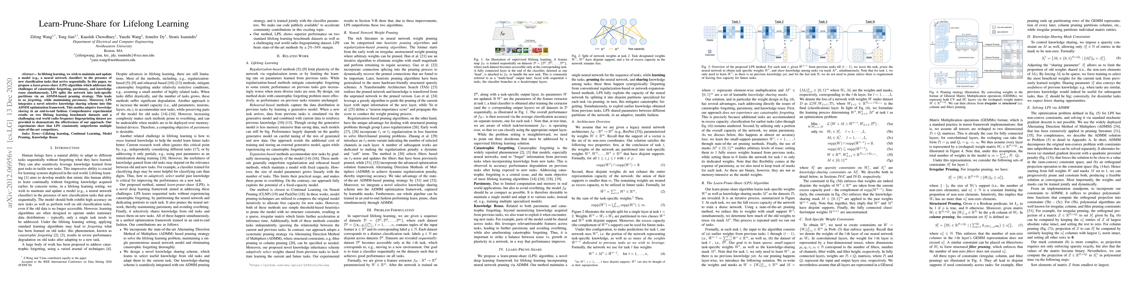 The paper proposes a learn-prune-share (LPS) algorithm for lifelong learning that mitigates catastrophic forgetting, maintains parsimony, and enables adaptive knowledge reuse through task-specific network partitioning and selective knowledge sharing. Experimental results demonstrate LPS's superior performance over state-of-the-art methods on multiple datasets.