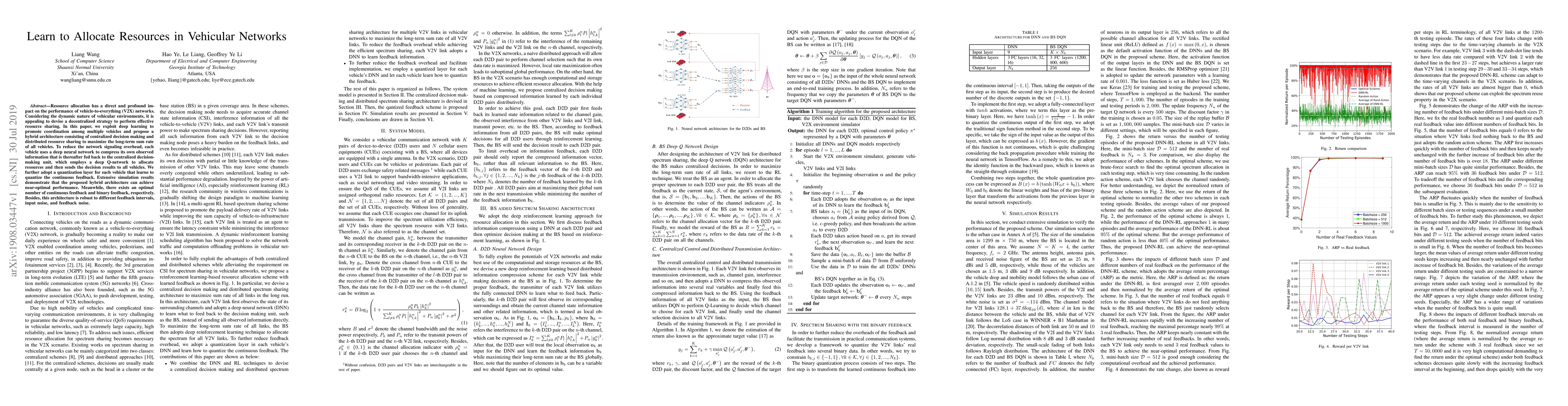 This research paper proposes a hybrid architecture for resource allocation in vehicular networks using deep learning to maximize long-term sum rate among vehicles with reduced signaling overhead.