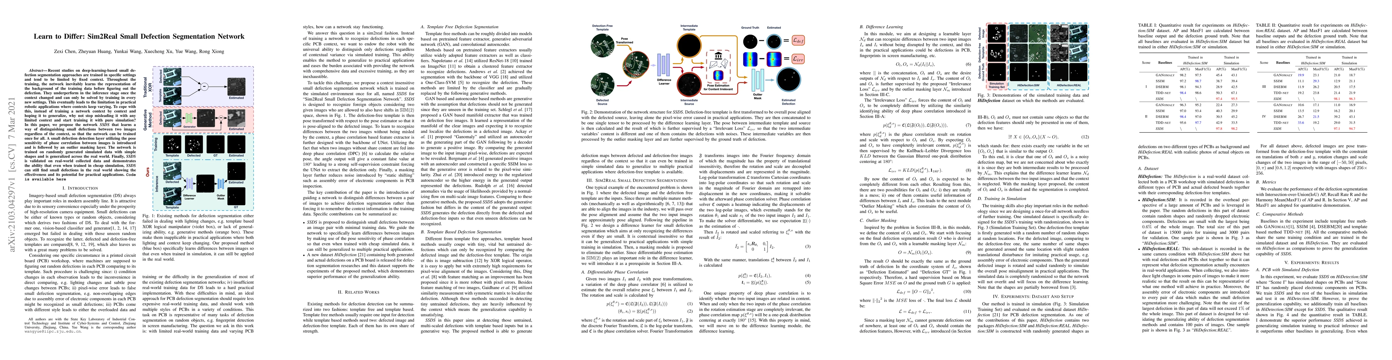 Recent studies on deep-learning-based small defection segmentation approaches are trained in specific settings and tend to be limited by fixed context. Throughout the training, the network inevitably learns the representation of the background of the training data before figuring out the defection. They underperform in the inference stage once the context changed and can only be solved by training in every new setting. This eventually leads to the limitation in practical robotic applications where contexts keep varying. To cope with this, instead of training a network context by context and hoping it to generalize, why not stop misleading it with any limited context and start training it with pure simulation? In this paper, we propose the network SSDS that learns a way of distinguishing small defections between two images regardless of the context, so that the network can be trained once for all. A small defection detection layer utilizing the pose sensitivity of phase correlation between images is introduced and is followed by an outlier masking layer. The network is trained on randomly generated simulated data with simple shapes and is generalized across the real world. Finally, SSDS is validated on real-world collected data and demonstrates the ability that even when trained in cheap simulation, SSDS can still find small defections in the real world showing the effectiveness and its potential for practical applications.