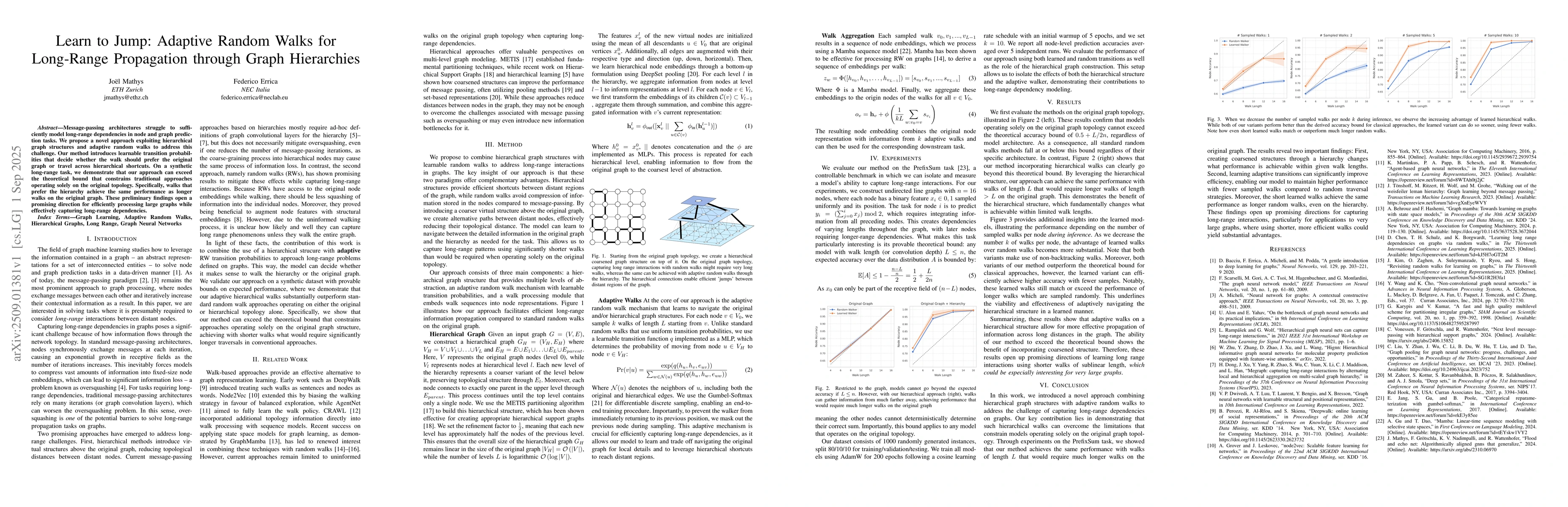 Message-passing architectures struggle to sufficiently model long-range dependencies in node and graph prediction tasks. We propose a novel approach exploiting hierarchical graph structures and adaptive random walks to address this challenge. Our method introduces learnable transition probabilities that decide whether the walk should prefer the original graph or travel across hierarchical shortcuts. On a synthetic long-range task, we demonstrate that our approach can exceed the theoretical bound that constrains traditional approaches operating solely on the original topology. Specifically, walks that prefer the hierarchy achieve the same performance as longer walks on the original graph. These preliminary findings open a promising direction for efficiently processing large graphs while effectively capturing long-range dependencies.