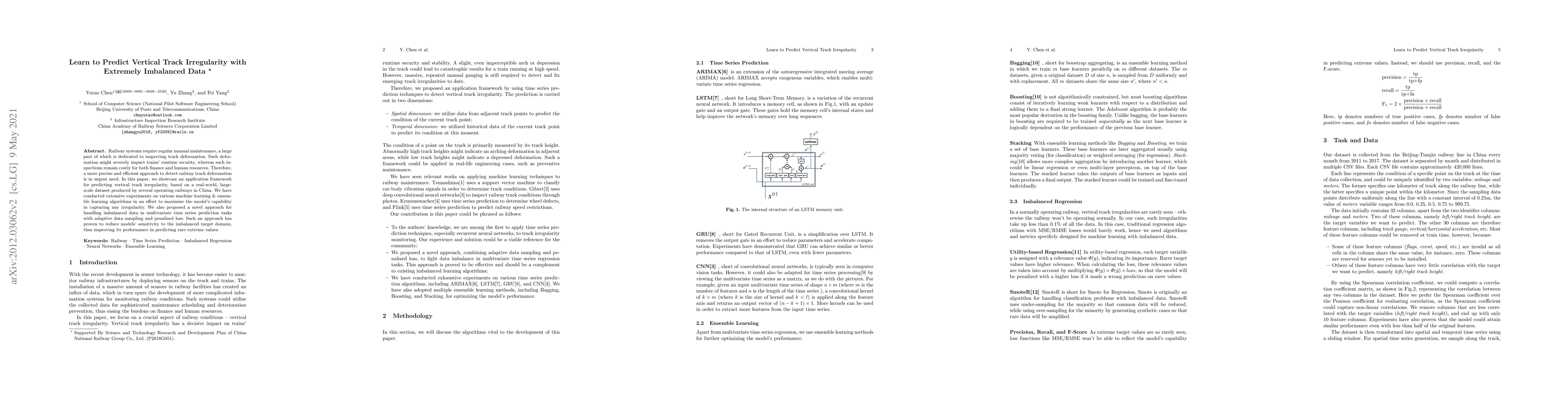 Railway systems require regular manual maintenance, a large part of which is dedicated to inspecting track deformation. Such deformation might severely impact trains' runtime security, whereas such inspections remain costly for both finance and human resources. Therefore, a more precise and efficient approach to detect railway track deformation is in urgent need. In this paper, we showcase an application framework for predicting vertical track irregularity, based on a real-world, large-scale dataset produced by several operating railways in China. We have conducted extensive experiments on various machine learning & ensemble learning algorithms in an effort to maximize the model's capability in capturing any irregularity. We also proposed a novel approach for handling imbalanced data in multivariate time series prediction tasks with adaptive data sampling and penalized loss. Such an approach has proven to reduce models' sensitivity to the imbalanced target domain, thus improving its performance in predicting rare extreme values.