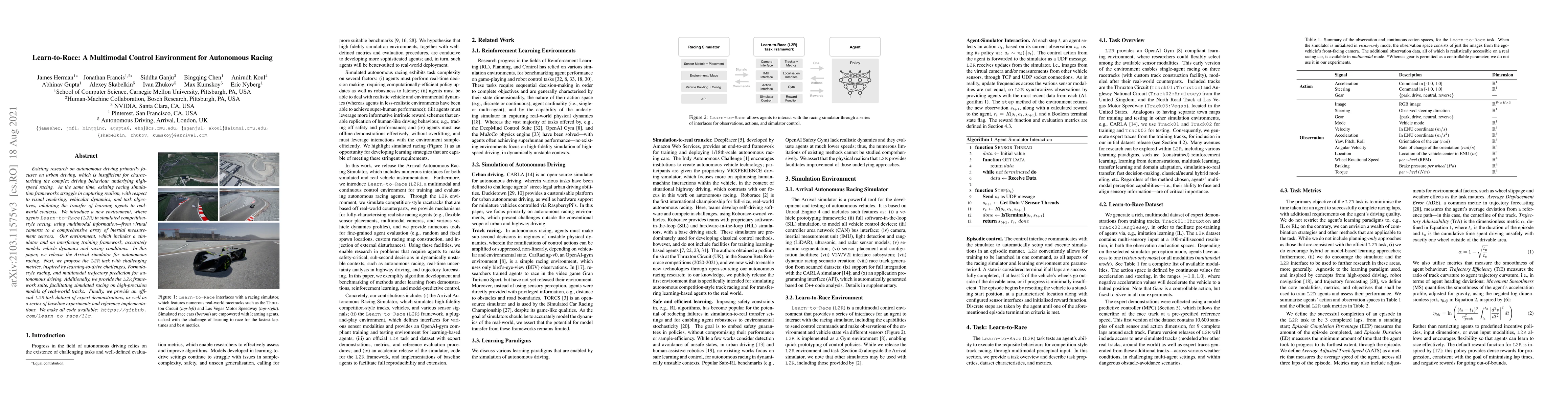 This paper introduces Learn-to-Race (L2R), a multimodal control environment for training autonomous racing agents, addressing the limitations of existing urban driving research and simulation frameworks. The L2R environment combines realistic vehicle dynamics and racing conditions with multimodal sensory inputs, offering a comprehensive simulator for high-speed racing and releasing a dataset and code for further research.