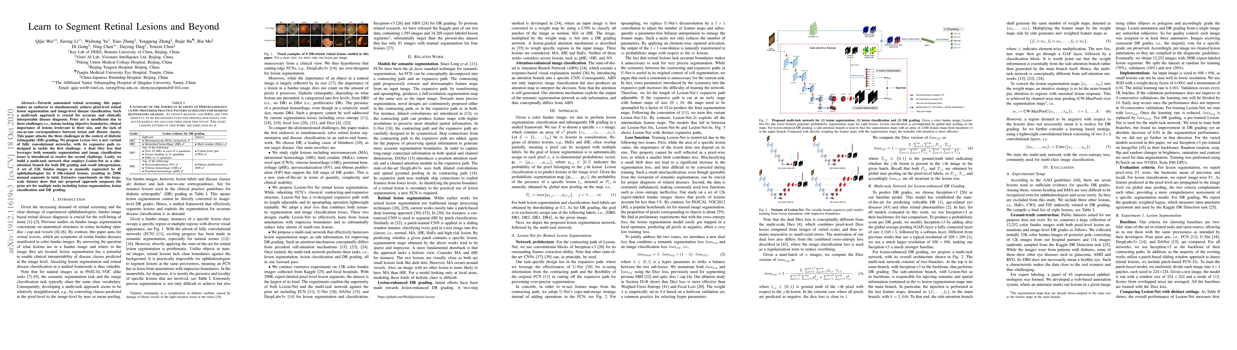 This paper proposes Lesion-Net, a variant of fully convolutional networks for simultaneous retinal lesion segmentation and diabetic retinopathy grading, addressing challenges of boundary ambiguity, lesion relevance, and class correspondence. Extensive experiments on a large-scale dataset demonstrate superior performance over prior methods.