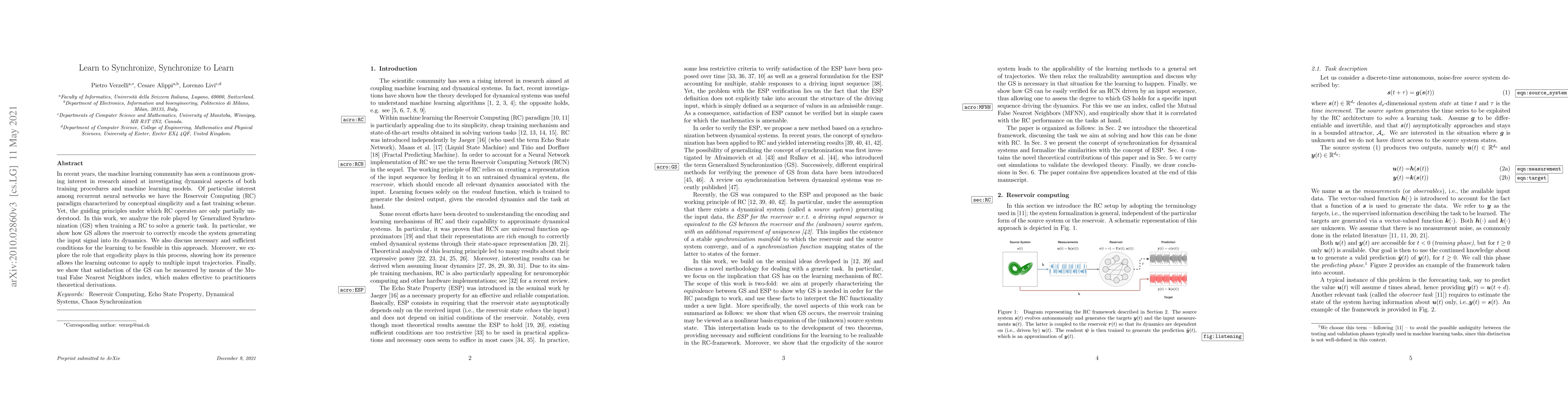 This paper explores the role of Generalized Synchronization in Reservoir Computing (RC) paradigm for machine learning, showing how it enables correct encoding and learning outcomes. The authors introduce a new metric to measure GS satisfaction, called Mutual False Nearest Neighbors index.