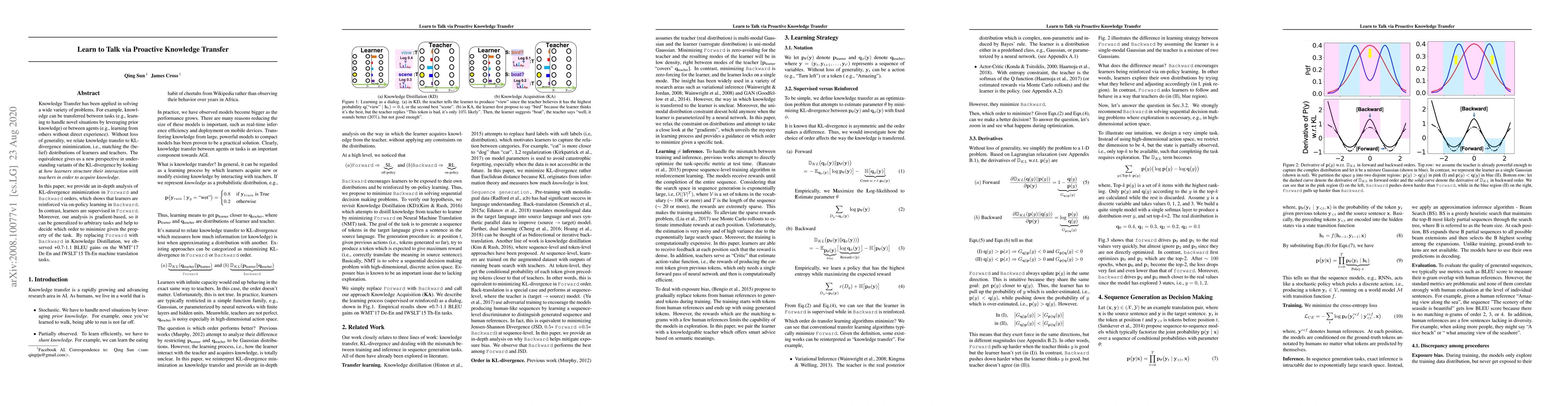 Knowledge Transfer has been applied in solving a wide variety of problems. For example, knowledge can be transferred between tasks (e.g., learning to handle novel situations by leveraging prior knowledge) or between agents (e.g., learning from others without direct experience). Without loss of generality, we relate knowledge transfer to KL-divergence minimization, i.e., matching the (belief) distributions of learners and teachers. The equivalence gives us a new perspective in understanding variants of the KL-divergence by looking at how learners structure their interaction with teachers in order to acquire knowledge. In this paper, we provide an in-depth analysis of KL-divergence minimization in Forward and Backward orders, which shows that learners are reinforced via on-policy learning in Backward. In contrast, learners are supervised in Forward. Moreover, our analysis is gradient-based, so it can be generalized to arbitrary tasks and help to decide which order to minimize given the property of the task. By replacing Forward with Backward in Knowledge Distillation, we observed +0.7-1.1 BLEU gains on the WMT'17 De-En and IWSLT'15 Th-En machine translation tasks.