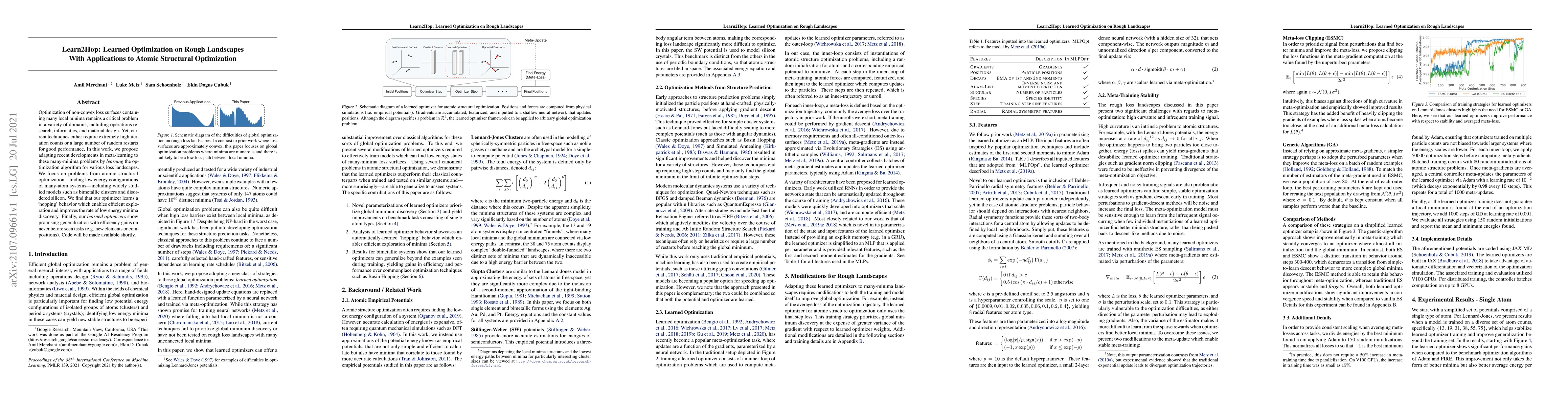 Optimization of non-convex loss surfaces containing many local minima remains a critical problem in a variety of domains, including operations research, informatics, and material design. Yet, current techniques either require extremely high iteration counts or a large number of random restarts for good performance. In this work, we propose adapting recent developments in meta-learning to these many-minima problems by learning the optimization algorithm for various loss landscapes. We focus on problems from atomic structural optimization--finding low energy configurations of many-atom systems--including widely studied models such as bimetallic clusters and disordered silicon. We find that our optimizer learns a 'hopping' behavior which enables efficient exploration and improves the rate of low energy minima discovery. Finally, our learned optimizers show promising generalization with efficiency gains on never before seen tasks (e.g. new elements or compositions). Code will be made available shortly.