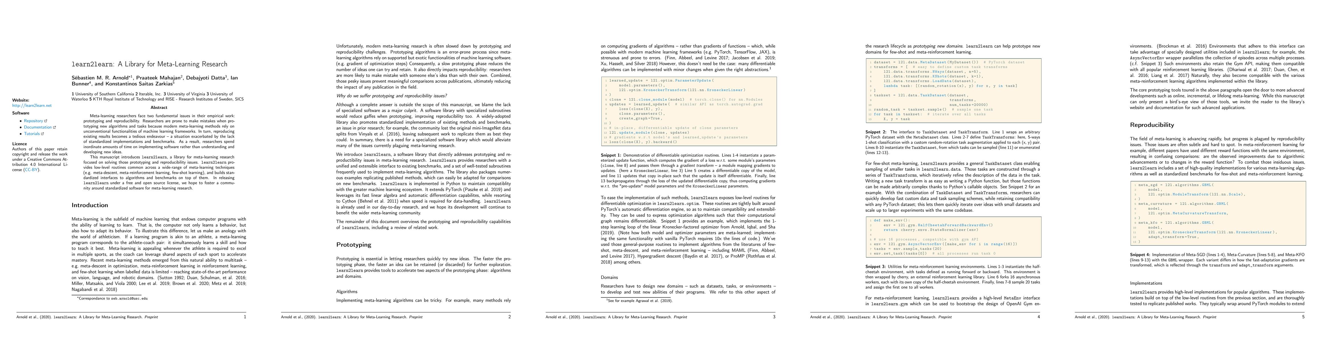 This paper introduces learn2learn, a library aimed at addressing prototyping and reproducibility challenges in meta-learning research. It provides standardized interfaces and low-level routines for various meta-learning techniques to facilitate easier implementation and result reproducibility.