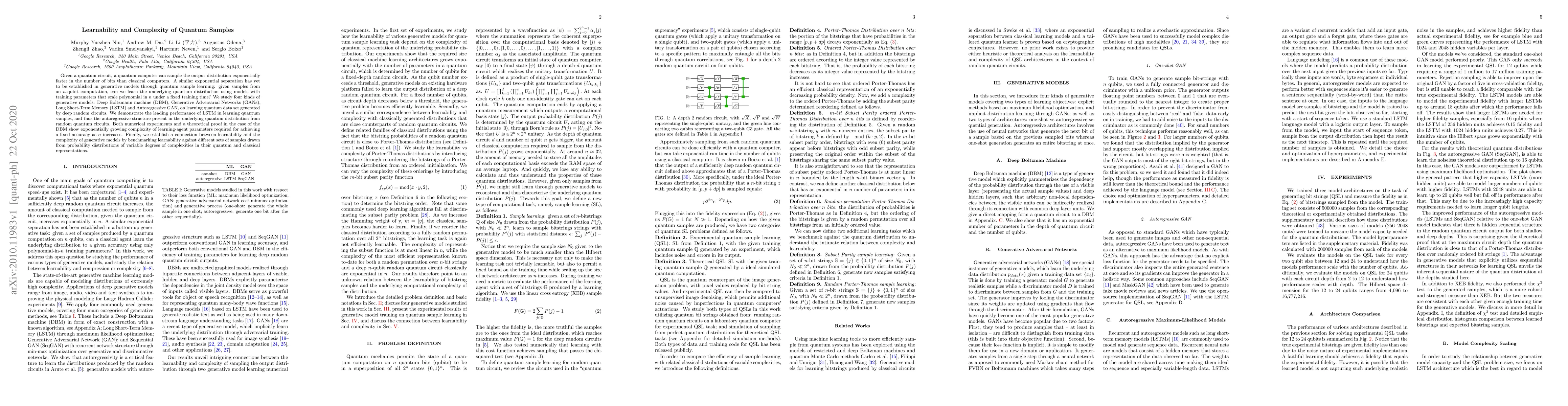 This paper investigates the learnability and complexity of quantum samples using various generative models, demonstrating that LSTMs perform best in learning quantum data from random circuits. It also shows that learning complexity increases exponentially with the number of qubits for most models, highlighting the challenges in quantum sample learning.