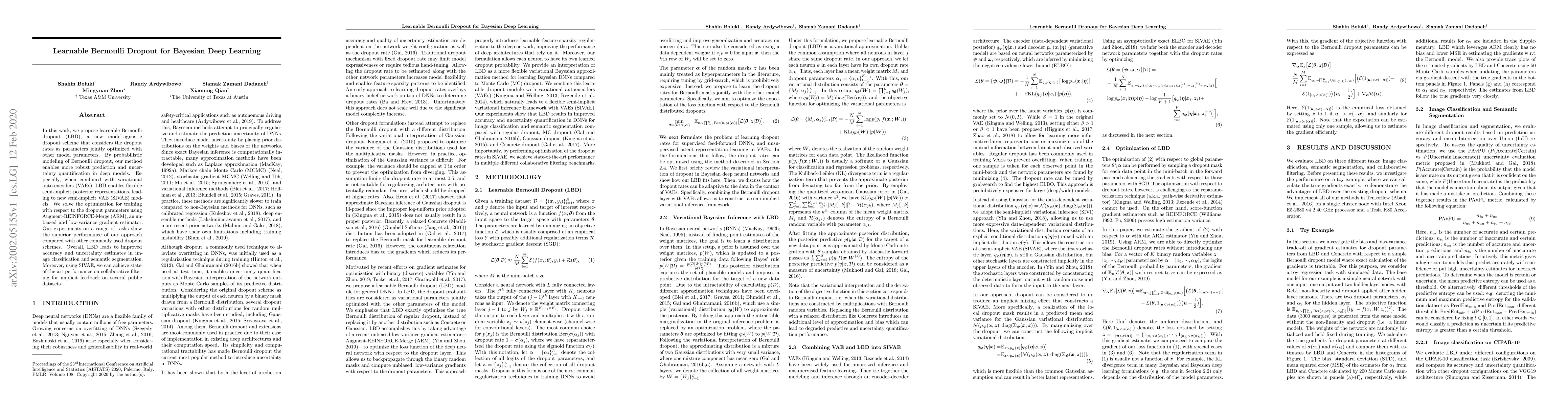 This paper introduces learnable Bernoulli dropout (LBD), a model-agnostic dropout method that optimizes dropout rates alongside model parameters, enhancing robustness and uncertainty quantification in deep learning. Combined with variational autoencoders, it leads to semi-implicit VAEs (SIVAEs) achieving state-of-the-art results in collaborative filtering.