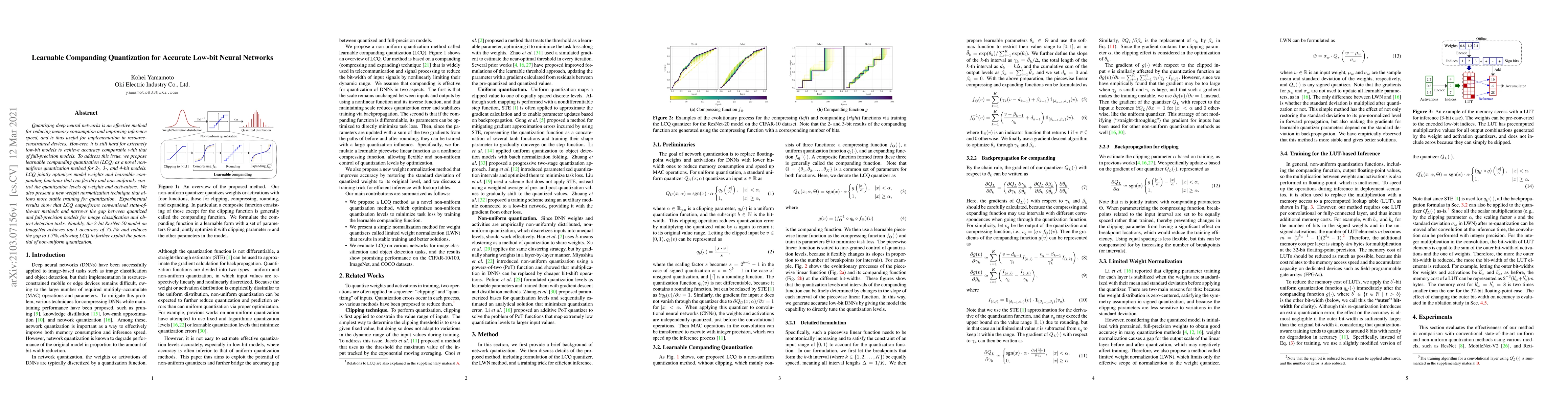 This paper proposes learnable companding quantization (LCQ) to improve the accuracy of low-bit neural networks, achieving better performance than conventional methods by optimizing both model weights and learnable companding functions. The 2-bit ResNet-50 model using LCQ achieves 75.1% top-1 accuracy on ImageNet, reducing the accuracy gap to 1.7% compared to full-precision models.