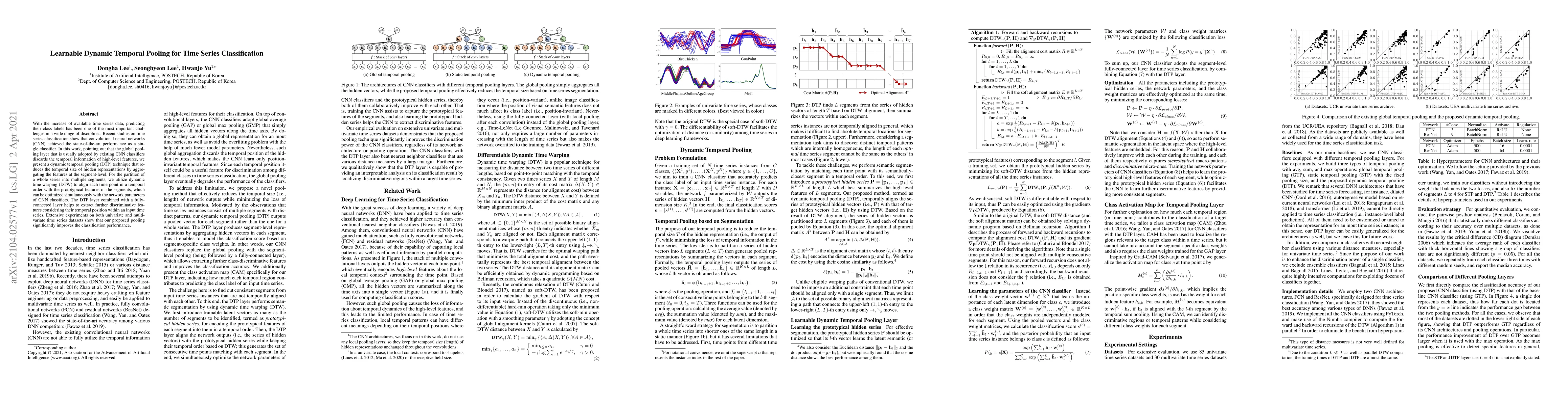 This paper introduces a learnable dynamic temporal pooling (DTP) technique to enhance time series classification performance by segmenting time series and optimizing feature aggregation with dynamic time warping. The DTP layer, combined with CNN classifiers, extracts discriminative features while preserving temporal information, leading to improved classification results on various datasets.