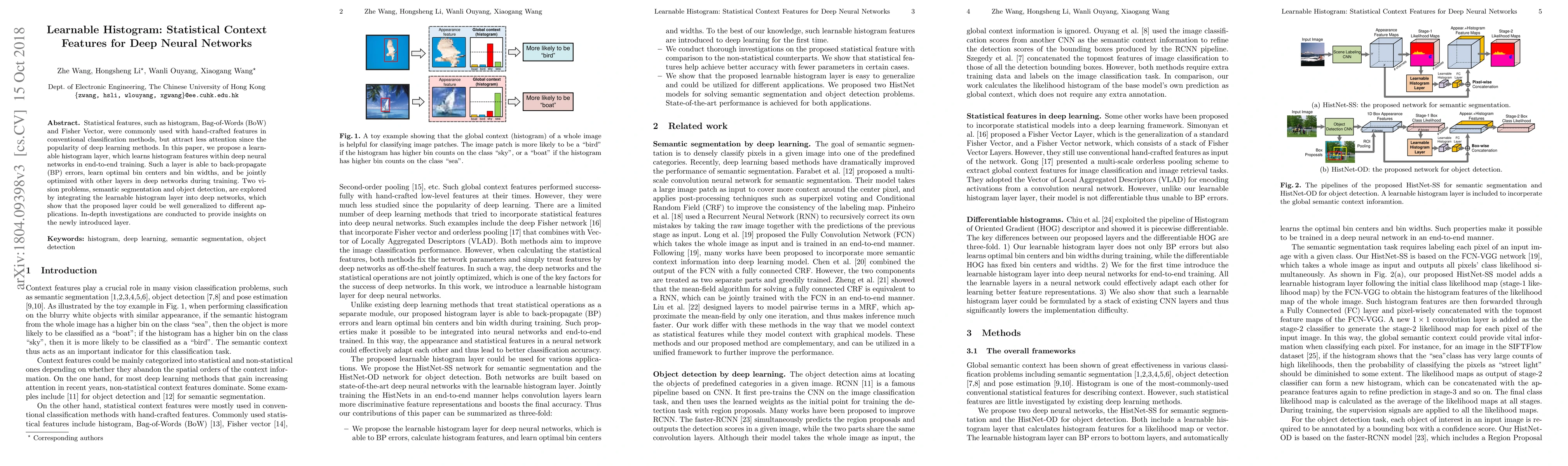 This paper introduces a learnable histogram layer that integrates statistical features into deep neural networks, enabling end-to-end learning of optimal bin centers and widths. Experiments in semantic segmentation and object detection demonstrate its effectiveness and generalizability.