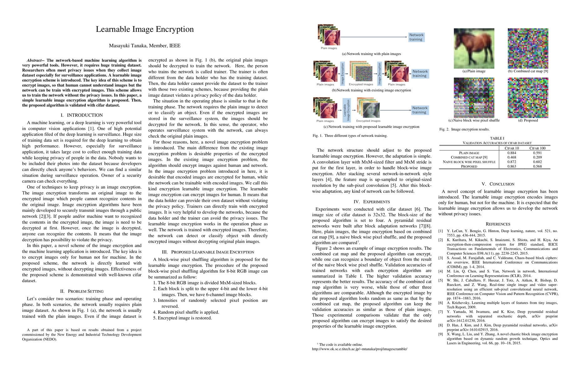 A novel block-wise pixel shuffling algorithm is proposed for learnable image encryption, enabling networks to be trained with encrypted images while maintaining comparable performance to plain images.