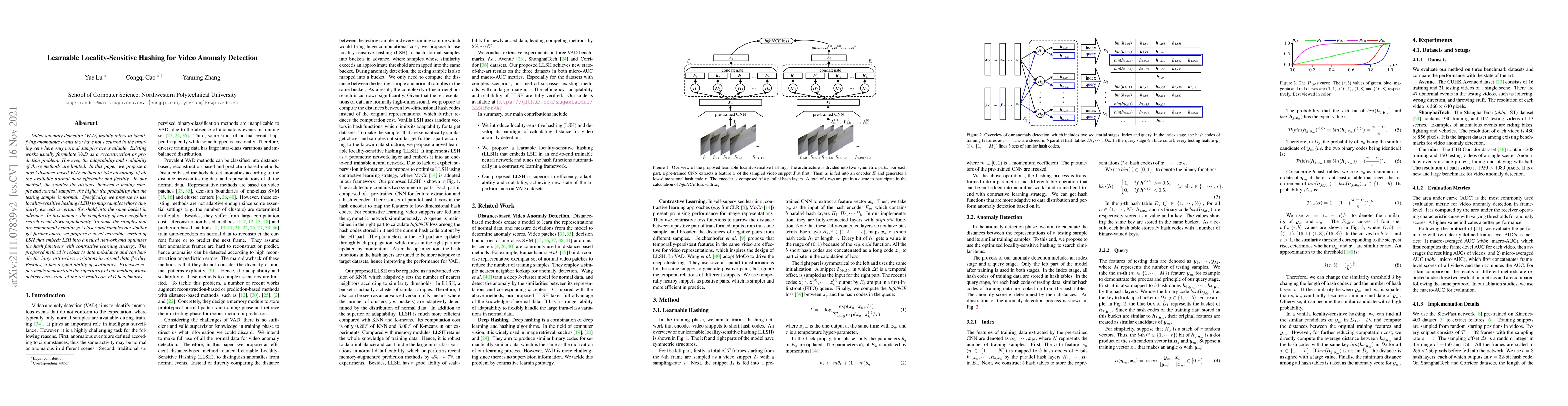 Video anomaly detection (VAD) mainly refers to identifying anomalous events that have not occurred in the training set where only normal samples are available. Existing works usually formulate VAD as a reconstruction or prediction problem. However, the adaptability and scalability of these methods are limited. In this paper, we propose a novel distance-based VAD method to take advantage of all the available normal data efficiently and flexibly. In our method, the smaller the distance between a testing sample and normal samples, the higher the probability that the testing sample is normal. Specifically, we propose to use locality-sensitive hashing (LSH) to map samples whose similarity exceeds a certain threshold into the same bucket in advance. In this manner, the complexity of near neighbor search is cut down significantly. To make the samples that are semantically similar get closer and samples not similar get further apart, we propose a novel learnable version of LSH that embeds LSH into a neural network and optimizes the hash functions with contrastive learning strategy. The proposed method is robust to data imbalance and can handle the large intra-class variations in normal data flexibly. Besides, it has a good ability of scalability. Extensive experiments demonstrate the superiority of our method, which achieves new state-of-the-art results on VAD benchmarks.