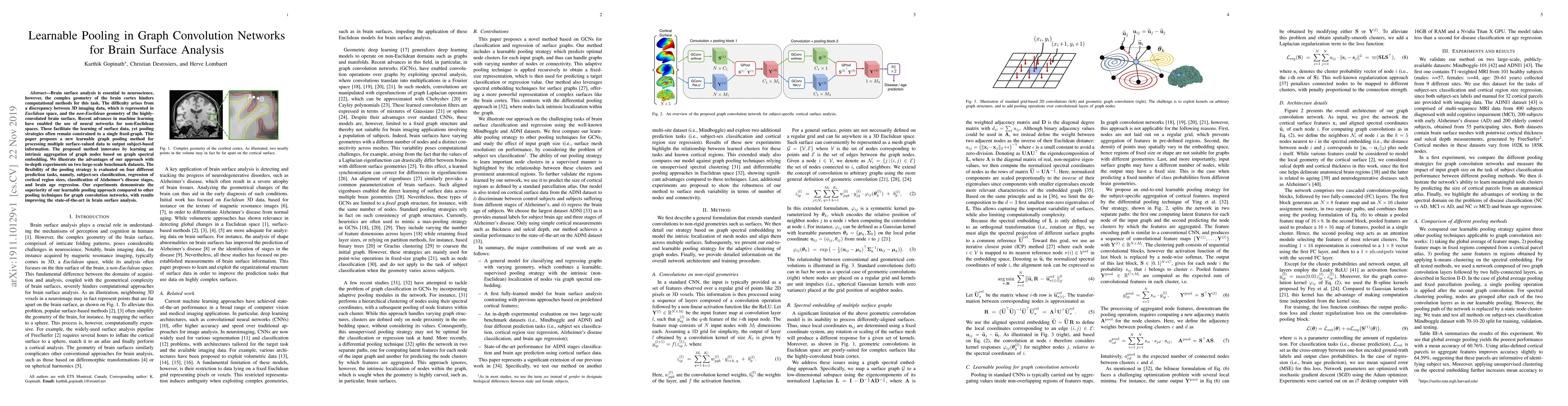 This paper introduces a novel learnable graph pooling method for graph convolution networks to analyze brain surface data, addressing the challenge of non-Euclidean geometry. The proposed method outperforms existing pooling techniques across various prediction tasks, achieving state-of-the-art results in brain surface analysis.