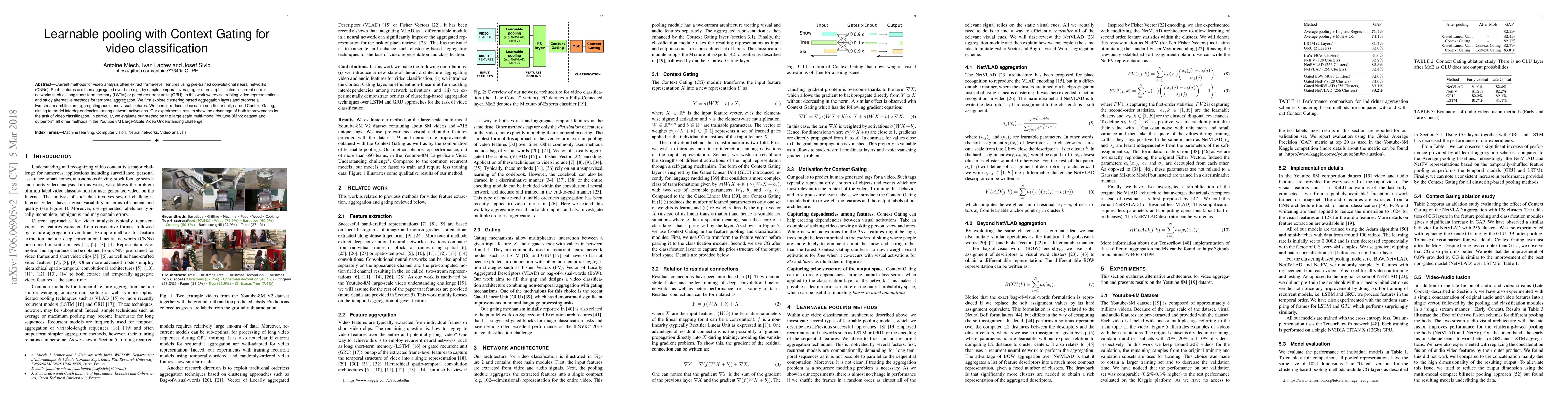 This paper proposes learnable pooling with Context Gating for video classification, revising existing methods by introducing clustering-based aggregation layers and a two-stream architecture for audio-visual features. The Context Gating unit models interdependencies among network activations, leading to superior performance on the Youtube-8M v2 dataset.