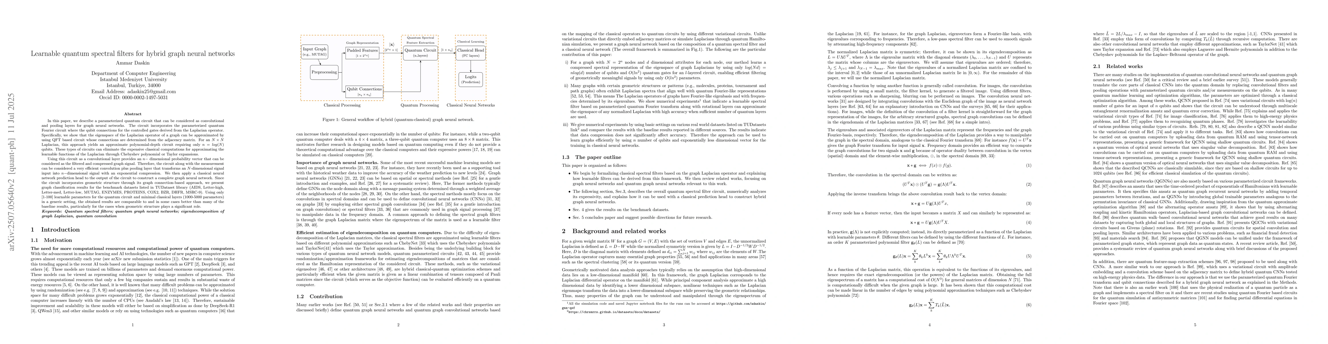 In this paper, we describe a parameterized quantum circuit that can be considered as convolutional and pooling layers for graph neural networks. The circuit incorporates the parameterized quantum Fourier circuit where the qubit connections for the controlled gates derived from the Laplacian operator. Specifically, we show that the eigenspace of the Laplacian operator of a graph can be approximated by using QFT based circuit whose connections are determined from the adjacency matrix. For an $N\times N$ Laplacian, this approach yields an approximate polynomial-depth circuit requiring only $n=log(N)$ qubits. These types of circuits can eliminate the expensive classical computations for approximating the learnable functions of the Laplacian through Chebyshev polynomial or Taylor expansions. Using this circuit as a convolutional layer provides an $n-$ dimensional probability vector that can be considered as the filtered and compressed graph signal. Therefore, the circuit along with the measurement can be considered a very efficient convolution plus pooling layer that transforms an $N$-dimensional signal input into $n-$dimensional signal with an exponential compression. We then apply a classical neural network prediction head to the output of the circuit to construct a complete graph neural network. Since the circuit incorporates geometric structure through its graph connection-based approach, we present graph classification results for the benchmark datasets listed in TUDataset library. Using only [1-100] learnable parameters for the quantum circuit and minimal classical layers (1000-5000 parameters) in a generic setting, the obtained results are comparable to and in some cases better than many of the baseline results, particularly for the cases when geometric structure plays a significant role.