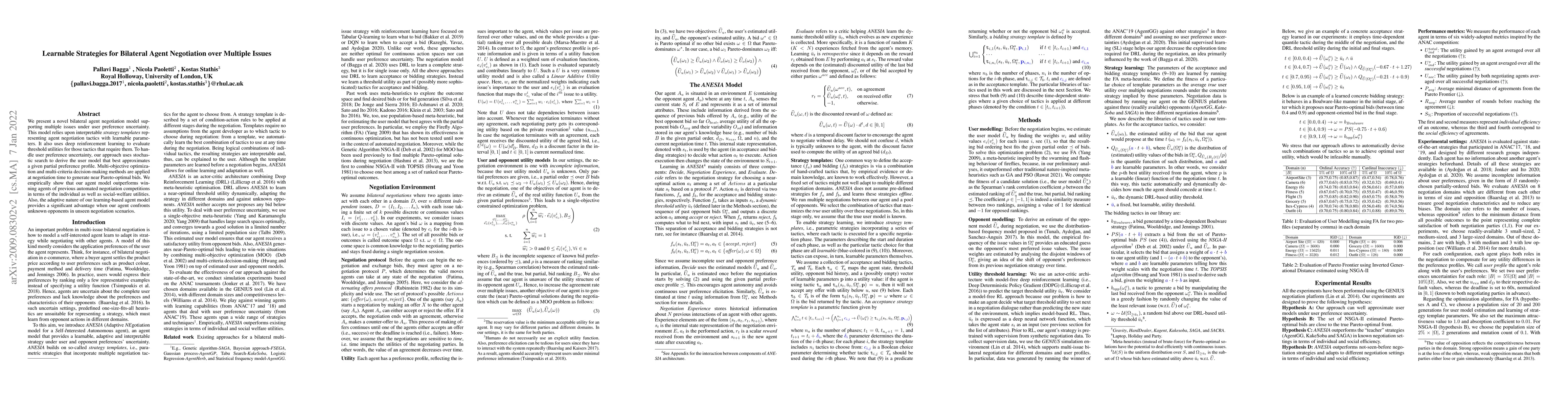 This paper introduces a bilateral negotiation model that enables an agent to learn optimal negotiation strategies over multiple issues, using interpretable templates and deep reinforcement learning. The model maximizes utility by adapting to user preference uncertainty and employs multi-objective optimization to achieve Pareto-optimal outcomes, outperforming competition agents in experimental evaluations.