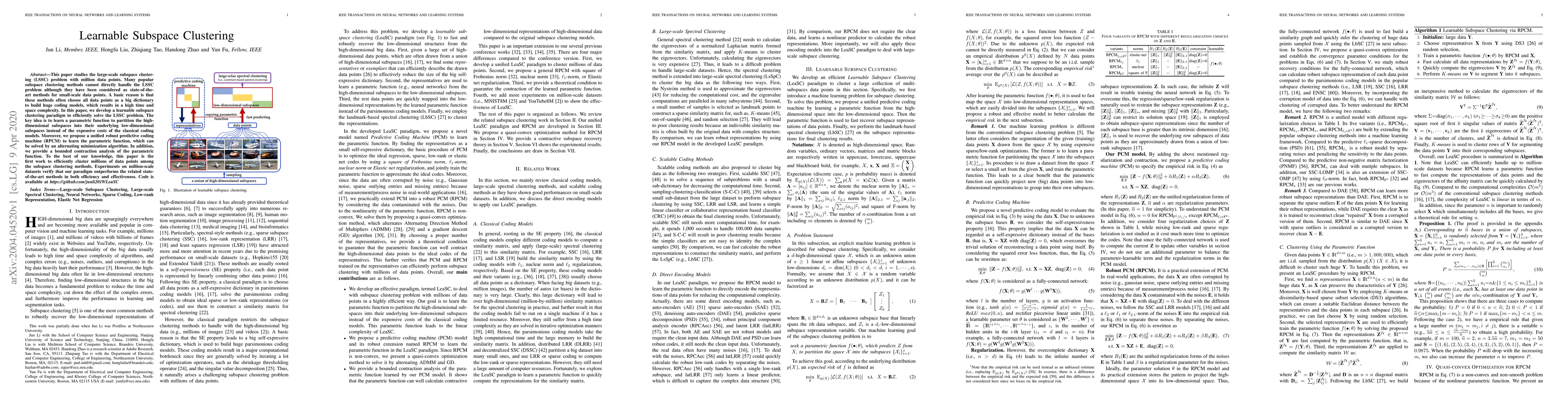 This paper introduces a learnable subspace clustering paradigm for efficiently handling large-scale subspace clustering problems, proposing a robust predictive coding machine to partition high-dimensional data into low-dimensional subspaces, and demonstrating superior performance over existing methods on million-scale datasets.