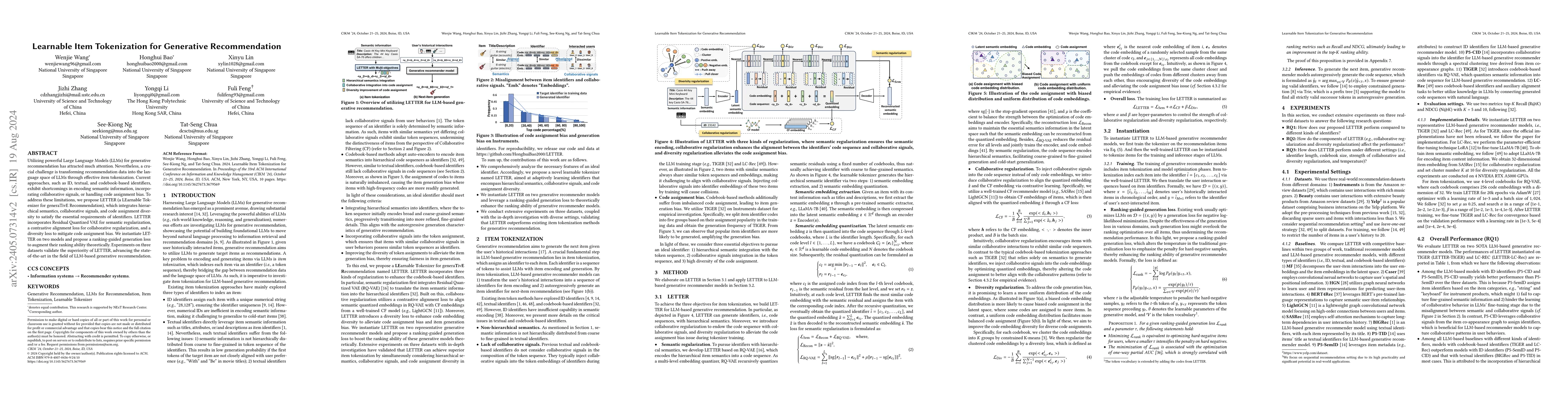 The paper introduces LETTER, a learnable tokenizer designed to improve LLM-based generative recommendation by integrating hierarchical semantics, collaborative signals, and mitigating code assignment bias through a Residual Quantized VAE, contrastive alignment loss, and a diversity loss. LETTER demonstrates superior performance in item tokenization across three datasets.