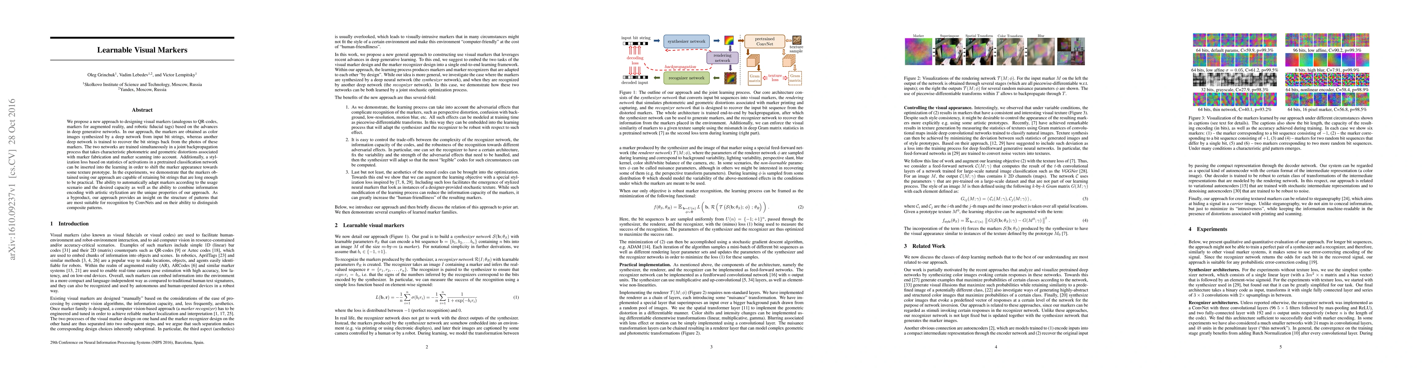 We propose a new approach to designing visual markers (analogous to QR-codes, markers for augmented reality, and robotic fiducial tags) based on the advances in deep generative networks. In our approach, the markers are obtained as color images synthesized by a deep network from input bit strings, whereas another deep network is trained to recover the bit strings back from the photos of these markers. The two networks are trained simultaneously in a joint backpropagation process that takes characteristic photometric and geometric distortions associated with marker fabrication and marker scanning into account. Additionally, a stylization loss based on statistics of activations in a pretrained classification network can be inserted into the learning in order to shift the marker appearance towards some texture prototype. In the experiments, we demonstrate that the markers obtained using our approach are capable of retaining bit strings that are long enough to be practical. The ability to automatically adapt markers according to the usage scenario and the desired capacity as well as the ability to combine information encoding with artistic stylization are the unique properties of our approach. As a byproduct, our approach provides an insight on the structure of patterns that are most suitable for recognition by ConvNets and on their ability to distinguish composite patterns.