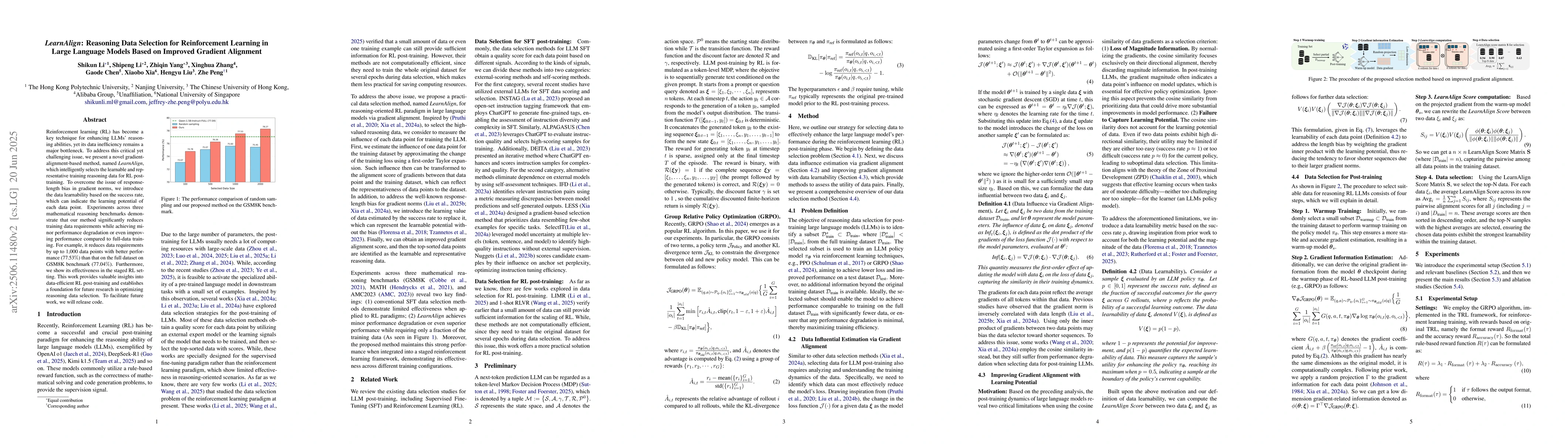 Reinforcement learning (RL) has become a key technique for enhancing LLMs' reasoning abilities, yet its data inefficiency remains a major bottleneck. To address this critical yet challenging issue, we present a novel gradient-alignment-based method, named LearnAlign, which intelligently selects the learnable and representative training reasoning data for RL post-training. To overcome the issue of response-length bias in gradient norms, we introduce the data learnability based on the success rate, which can indicate the learning potential of each data point. Experiments across three mathematical reasoning benchmarks demonstrate that our method significantly reduces training data requirements while achieving minor performance degradation or even improving performance compared to full-data training. For example, it reduces data requirements by up to 1,000 data points with better performance (77.53%) than that on the full dataset on GSM8K benchmark (77.04%). Furthermore, we show its effectiveness in the staged RL setting. This work provides valuable insights into data-efficient RL post-training and establishes a foundation for future research in optimizing reasoning data selection. To facilitate future work, we will release code.