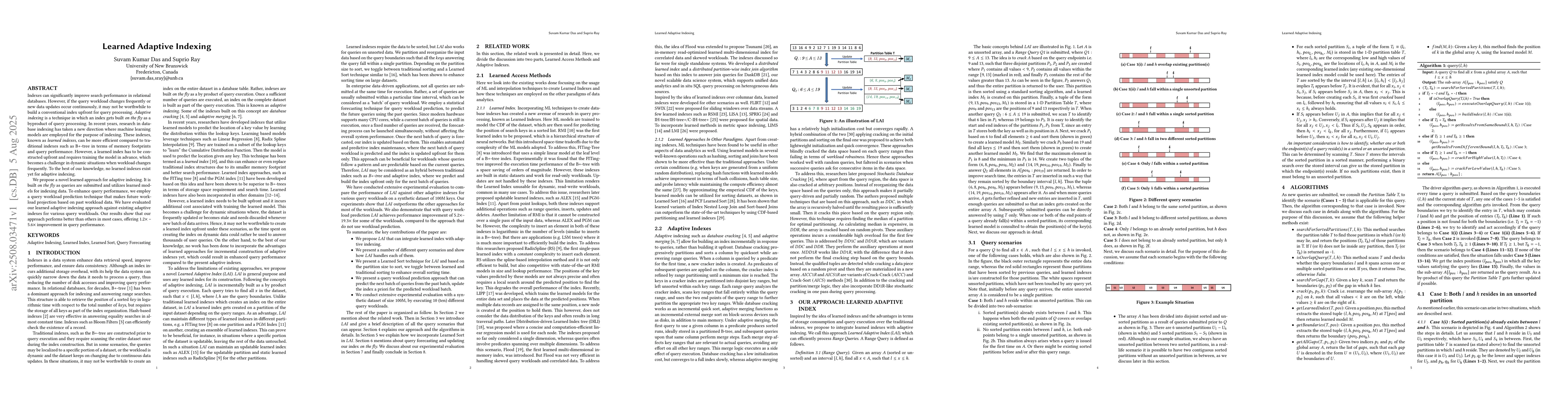 Indexes can significantly improve search performance in relational databases. However, if the query workload changes frequently or new data updates occur continuously, it may not be worthwhile to build a conventional index upfront for query processing. Adaptive indexing is a technique in which an index gets built on the fly as a byproduct of query processing. In recent years, research in database indexing has taken a new direction where machine learning models are employed for the purpose of indexing. These indexes, known as learned indexes, can be more efficient compared to traditional indexes such as B+-tree in terms of memory footprints and query performance. However, a learned index has to be constructed upfront and requires training the model in advance, which becomes a challenge in dynamic situations when workload changes frequently. To the best of our knowledge, no learned indexes exist yet for adaptive indexing. We propose a novel learned approach for adaptive indexing. It is built on the fly as queries are submitted and utilizes learned models for indexing data. To enhance query performance, we employ a query workload prediction technique that makes future workload projection based on past workload data. We have evaluated our learned adaptive indexing approach against existing adaptive indexes for various query workloads. Our results show that our approach performs better than others in most cases, offering 1.2x - 5.6x improvement in query performance.