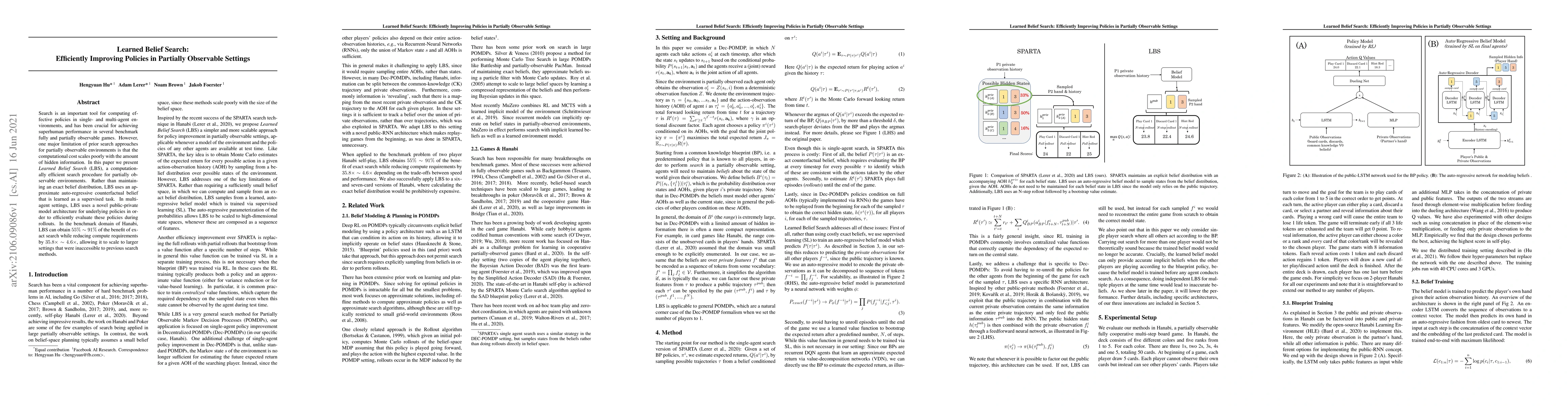 Search is an important tool for computing effective policies in single- and multi-agent environments, and has been crucial for achieving superhuman performance in several benchmark fully and partially observable games. However, one major limitation of prior search approaches for partially observable environments is that the computational cost scales poorly with the amount of hidden information. In this paper we present \emph{Learned Belief Search} (LBS), a computationally efficient search procedure for partially observable environments. Rather than maintaining an exact belief distribution, LBS uses an approximate auto-regressive counterfactual belief that is learned as a supervised task. In multi-agent settings, LBS uses a novel public-private model architecture for underlying policies in order to efficiently evaluate these policies during rollouts. In the benchmark domain of Hanabi, LBS can obtain 55% ~ 91% of the benefit of exact search while reducing compute requirements by $35.8 \times$ ~ $4.6 \times$, allowing it to scale to larger settings that were inaccessible to previous search methods.