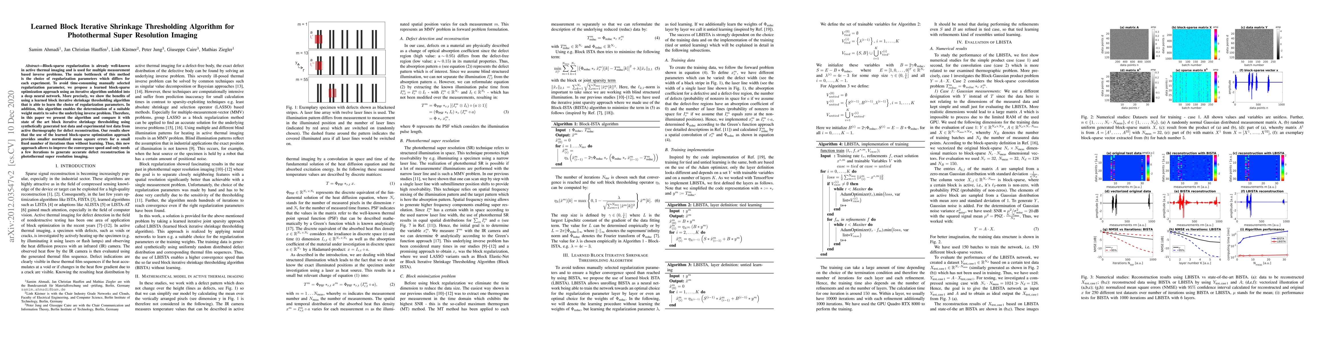 This paper proposes a learned block iterative shrinkage thresholding algorithm embedded in a deep neural network to optimize regularization parameters for photothermal super resolution imaging, achieving faster convergence and more accurate defect reconstruction compared to traditional methods. The algorithm outperforms state-of-the-art techniques in both synthetic and experimental thermography data.